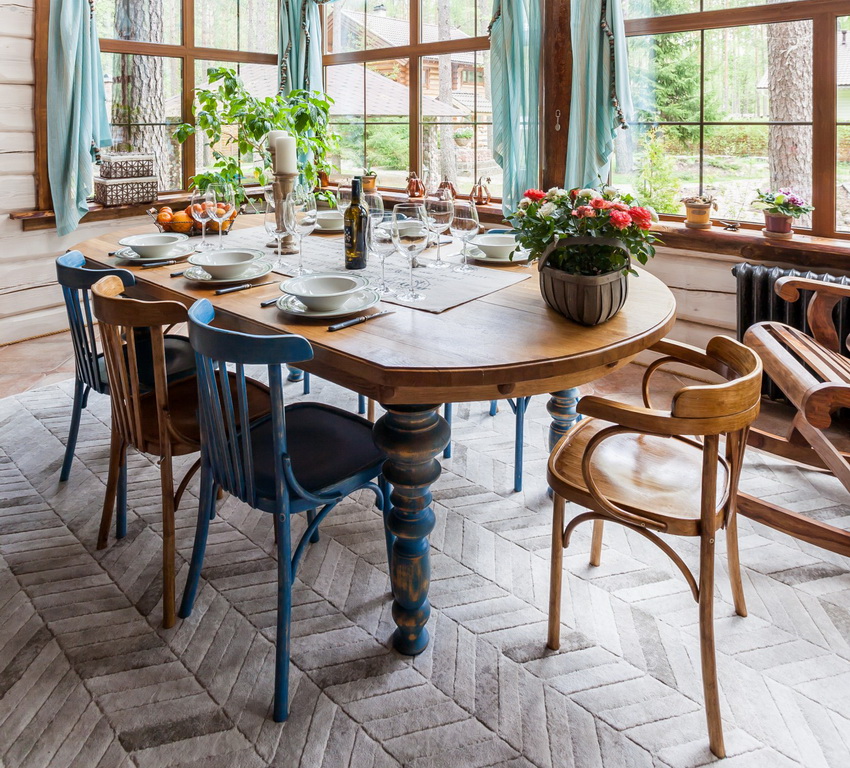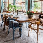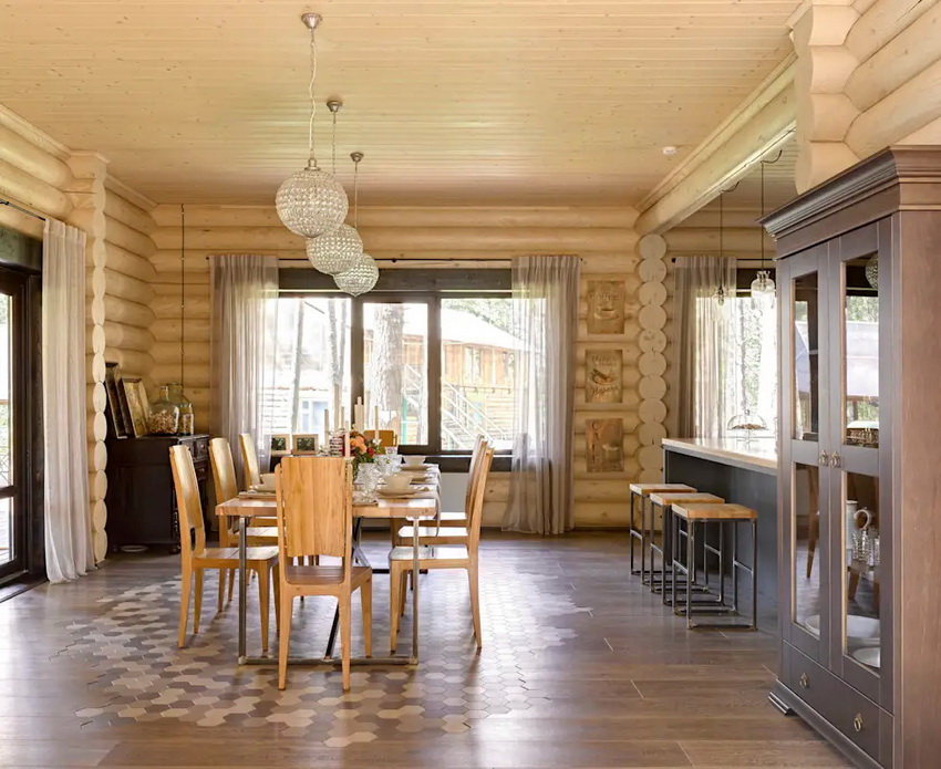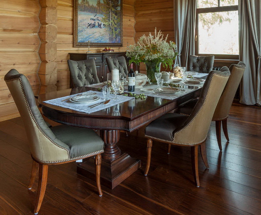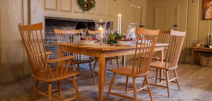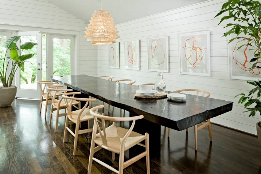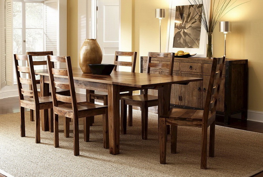 - borde og stole lavet af træ kan kombinere flere typer tømmer i deres design: massivt træ, træstammer, bjælker, brædder;