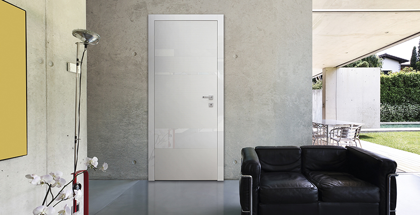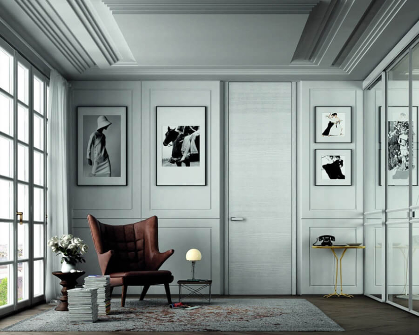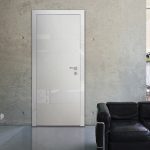 Dørdesign med en blank overflade ser perfekt ud i stuen. Disse modeller bruges også i kontorlokaler, selskabslokaler og saloner.