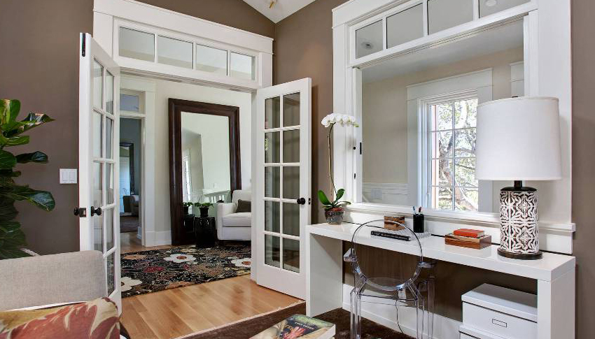 Hvide døre ser ganske imponerende ud i interiør med mørke trægulve.En smuk tilføjelse til dette design vil være platbands, lavet til at matche gulvet. Brug af disse elementer skaber en accent omkring lysdøren.