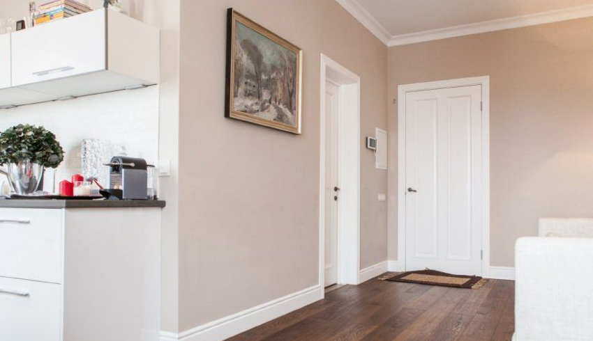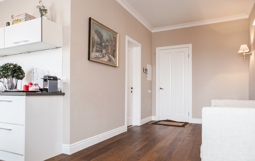 Vigtig! Du bør ikke bruge hvide døre i det indre af en lejlighed, hvor der er valgt en palet til vægdekoration, som er baseret på hvid med en hvilken som helst skygge, for eksempel creme eller beige. På baggrund af dørkonstruktionen vil sådanne vægge se beskidte ud, så det tilrådes at vælge lærredets farve for at matche det overordnede design.