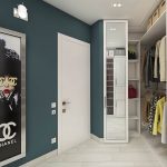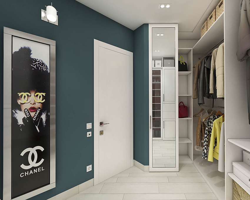 For at skabe en atmosfære af ro og friskhed anbefaler vi at bruge en blå finish. Kombinationen af kølige vægge og en ren hvid dør er den eneste mulighed, der fungerer i det blå. Et lignende design bruges normalt i klassiske stilarter. I dette tilfælde suppleres en hvid dør godt med en efterligning af panelbeklædning. Til dette kan rammer fremstillet af lister anvendes.