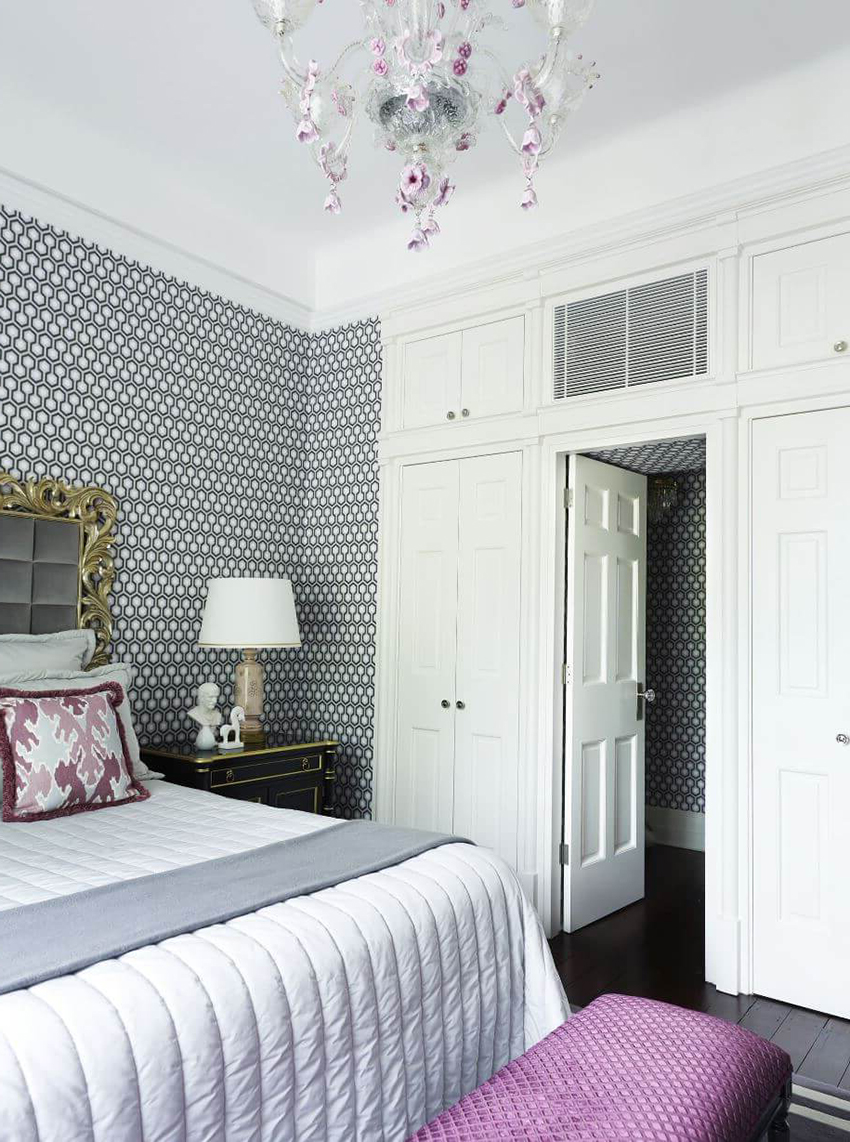 Kombinationen af hvide døre og lilla vægge bruges til at skabe en luksuriøs og statelig indstilling. Den lilla farve er bemærkelsesværdig for dens mætning, den er vanskelig for den menneskelige psyke og kan derfor forårsage hurtig udtømning af nervesystemet. Som et resultat vil denne situation kun være deprimerende. Tilstedeværelsen af hvide døre i et sådant interiør negerer denne negative effekt.