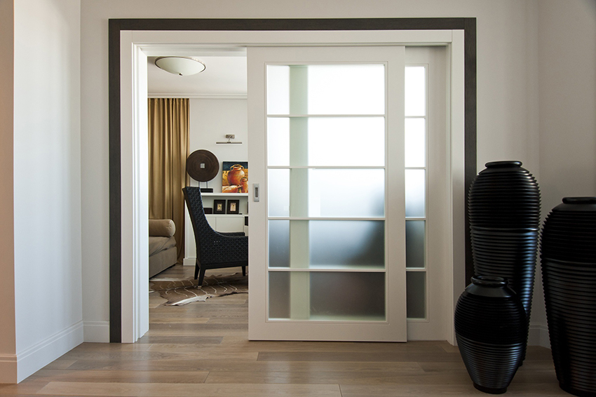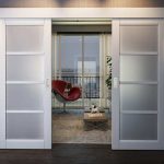 Bemærk! Hvis en hvid dør er dekoreret med tonet glas med et mønster, vil et sådant dekorativt element skille sig stærkt ud mod dens baggrund og distrahere opmærksomheden fra indretningen. For at undgå dette tilrådes det at bringe andre objekter ind i det indre af rummet, der kan afbalancere den lyse dekorative komponent.