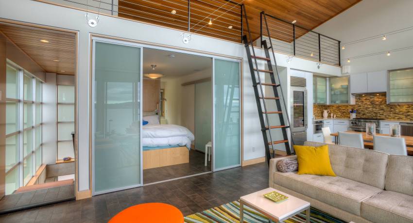 For at dekorere et stort rum i en moderne stil er det nok at bruge mørk vægdekoration, blegede egemøbler, der kontrasterer mod deres baggrund og en indvendig dør i samme skygge.