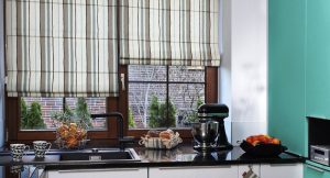 - I et smalt køkken ser romerske eller rullegardiner med vandrette striber organiske ud.