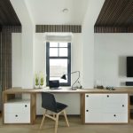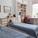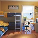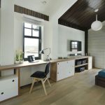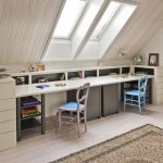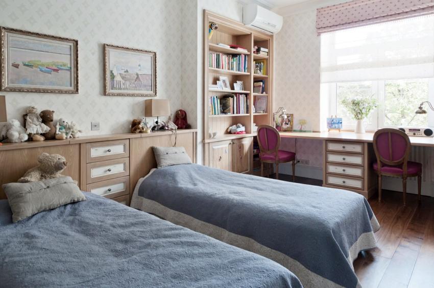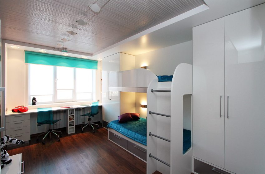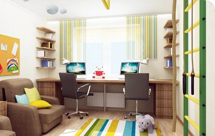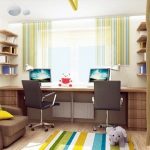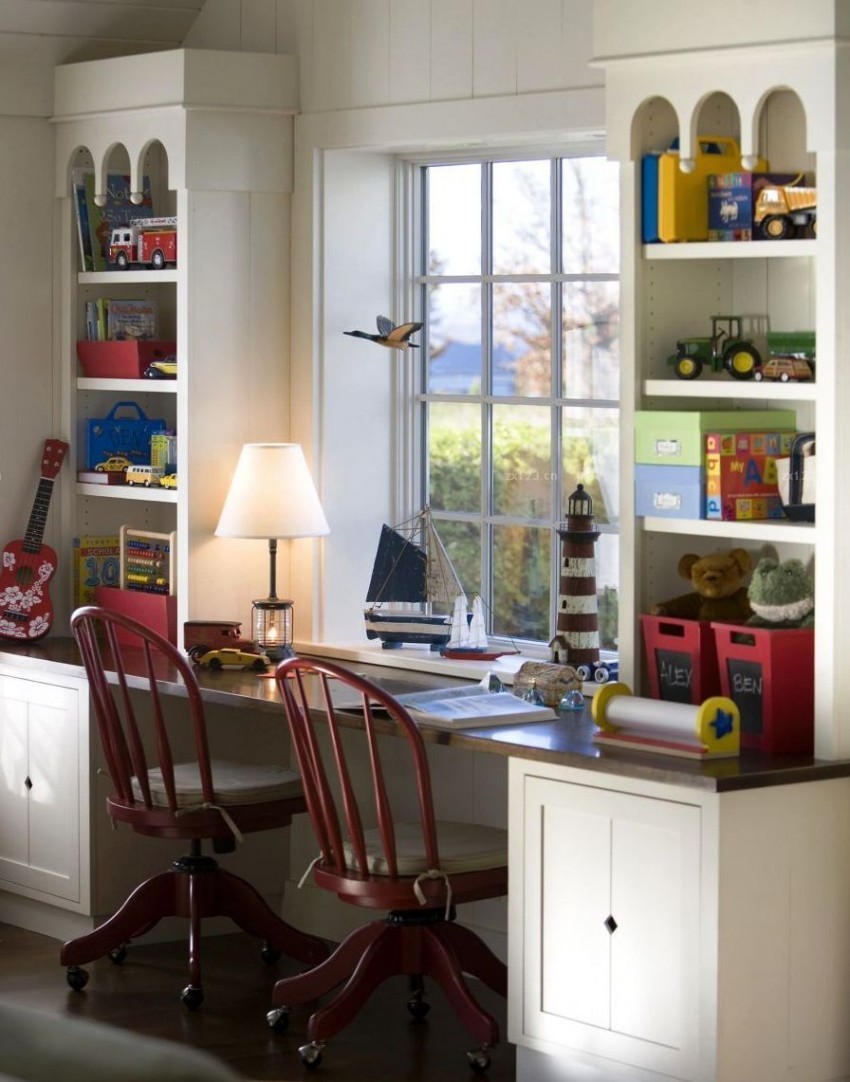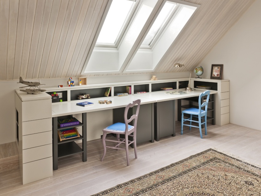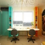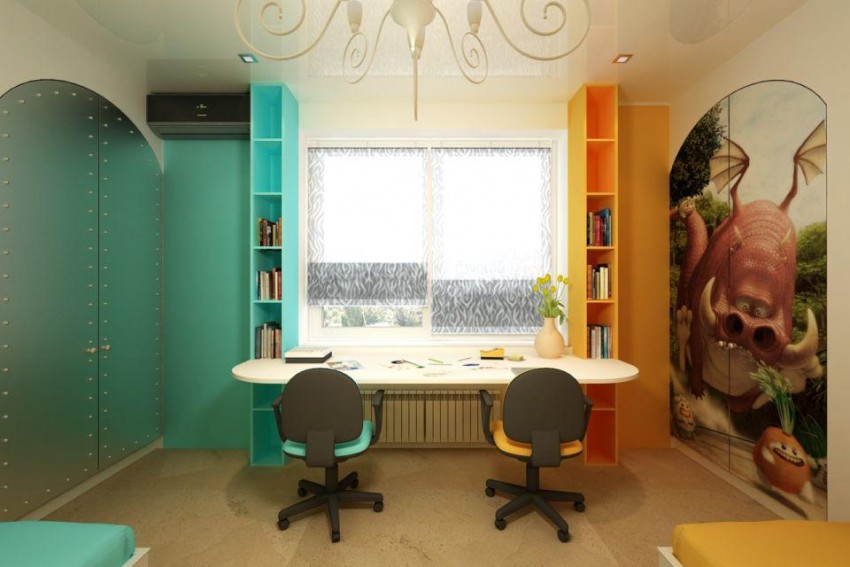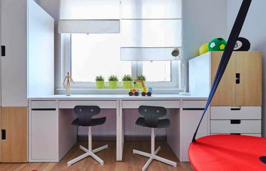 Hvis rummet er designet til to børn eller til flere yngre familiemedlemmer, vælges interiøret lidt anderledes. Og tabellen i dette tilfælde er ingen undtagelse. At skabe behagelige forhold for hvert barn og samtidig få ekstra plads er ikke et eventyr, men en meget reel mulighed. Det ser sådan ud: Bordpladen er placeret fra væg til væg - langs vinduet.På begge sider, under vindueskarmen, er der skabe og skabe med udtrækkelige skuffer, og i midten er bordet opdelt ved hjælp af en fælles kommode.