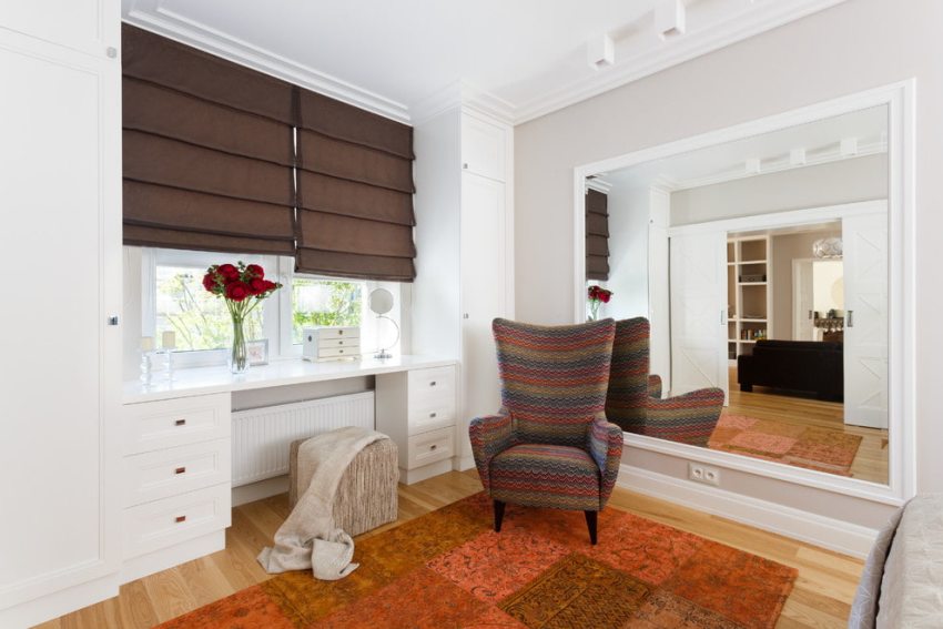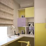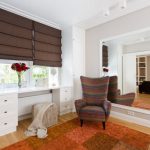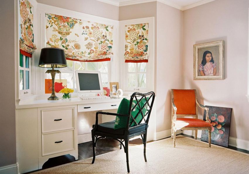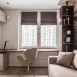 - Hvad angår gardinerne på vinduerne, i tilfælde af et vindueskarmbord, skal de være specielle. Da lange gardiner på ingen måde passer her, ville den bedste løsning være at købe gardiner af rulleform.
