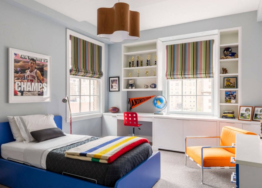 Hvis vinduet er lidt forskudt til siden, kan du designe et hjørne indbygget vindueskarm-bord. Det strækker sig til hjørnet og går logisk til den tilstødende væg. Således dannes et behageligt arbejdsområde for barnet.