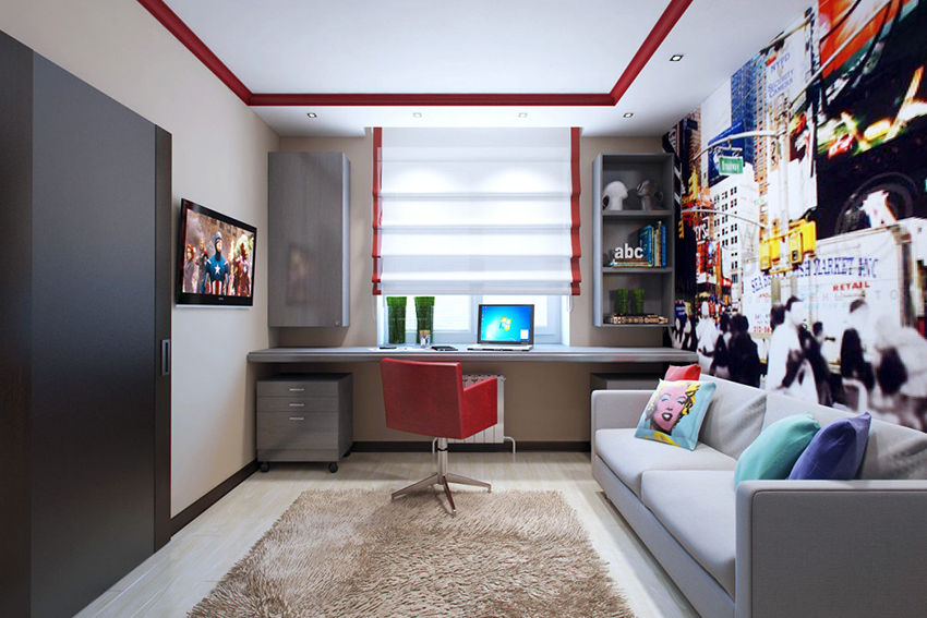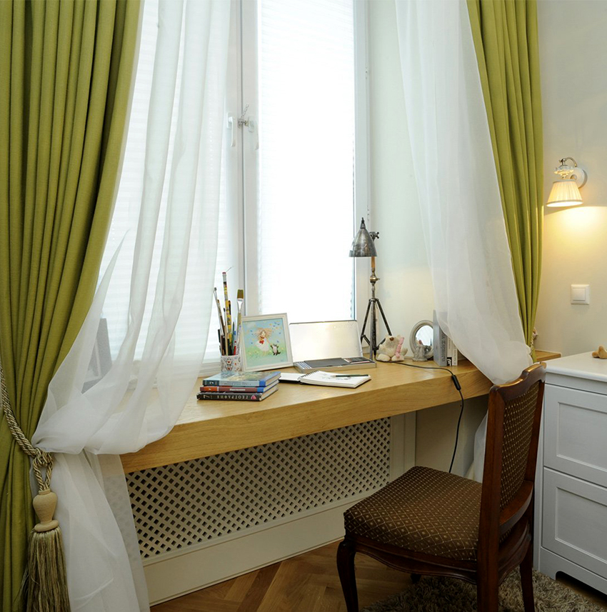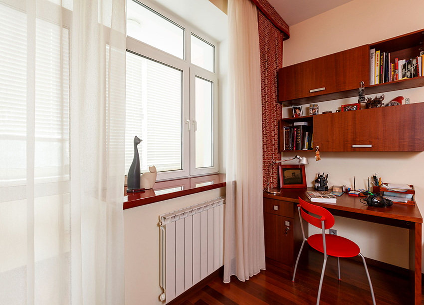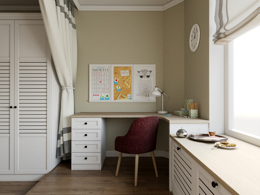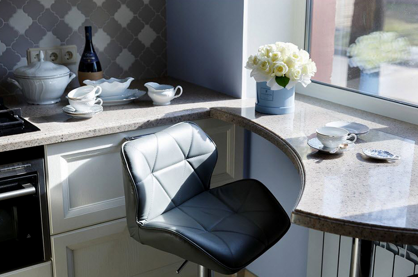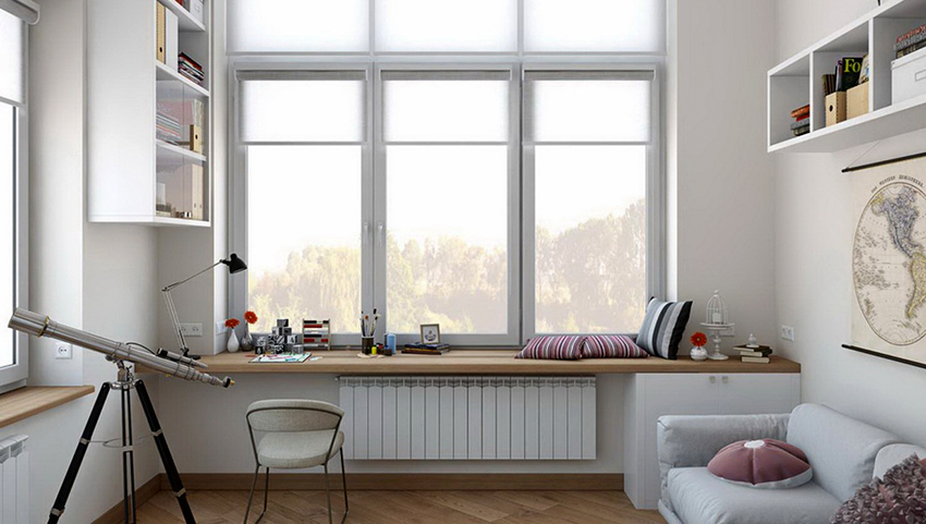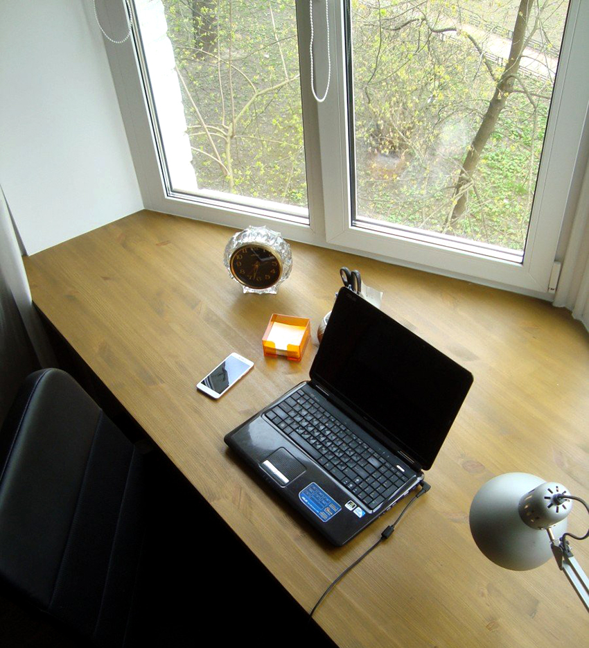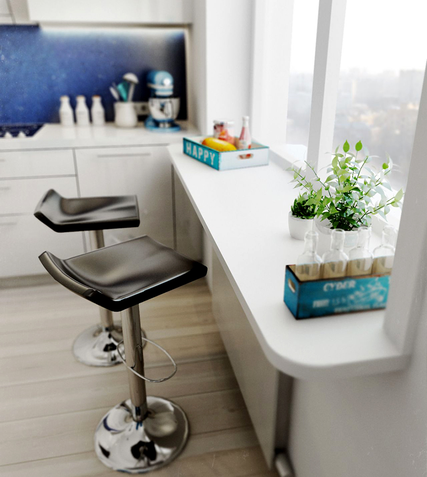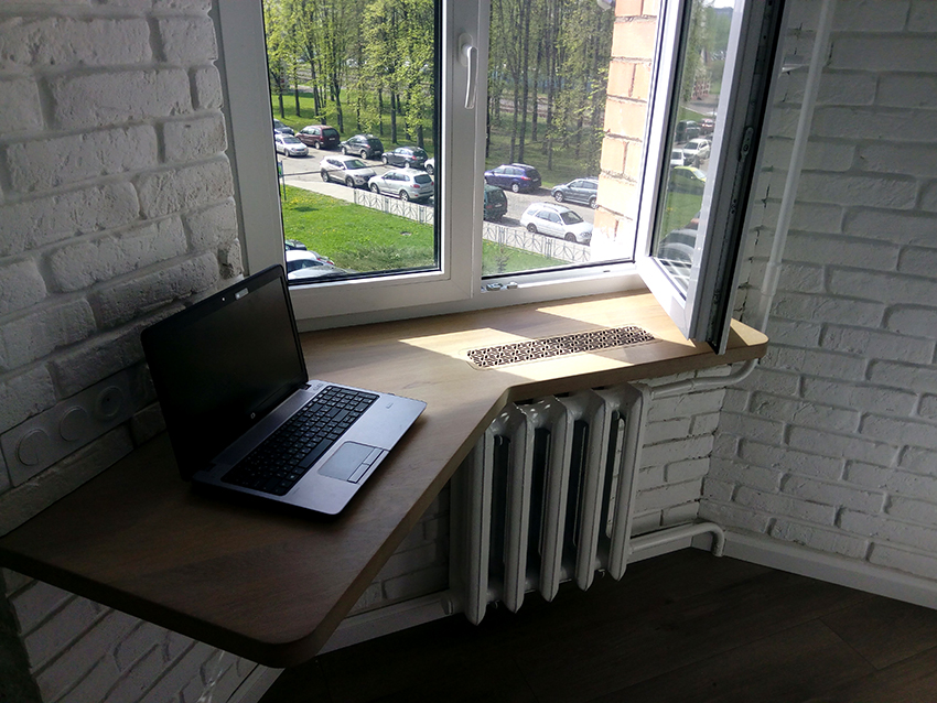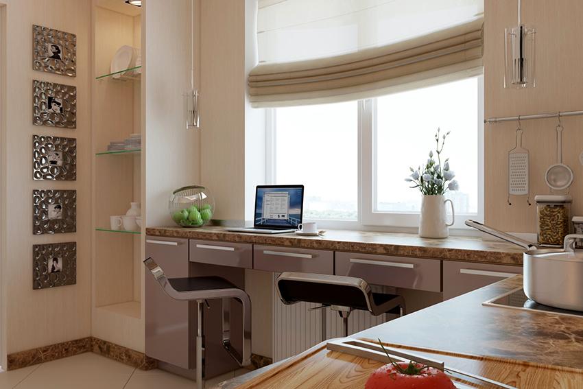 - Desktop. Det er ikke nødvendigt, at det kun var et skrivebord; i forhold til en studiolejlighed er det meget vigtigt at gøre vindueskarmen til en funktionel del af køkkenrummet.