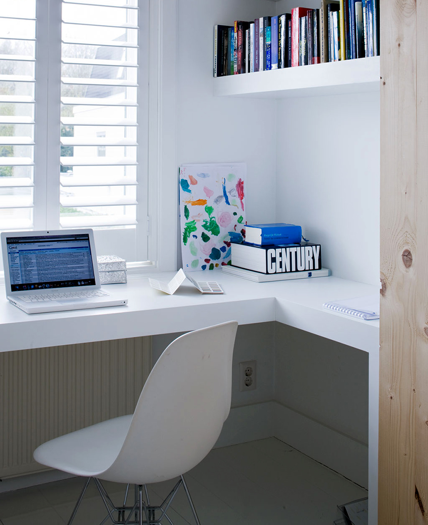 - Opbevaringsplads til bøger. Mini-biblioteket kan suppleres med et side-by-side bord og en lysarmatur.