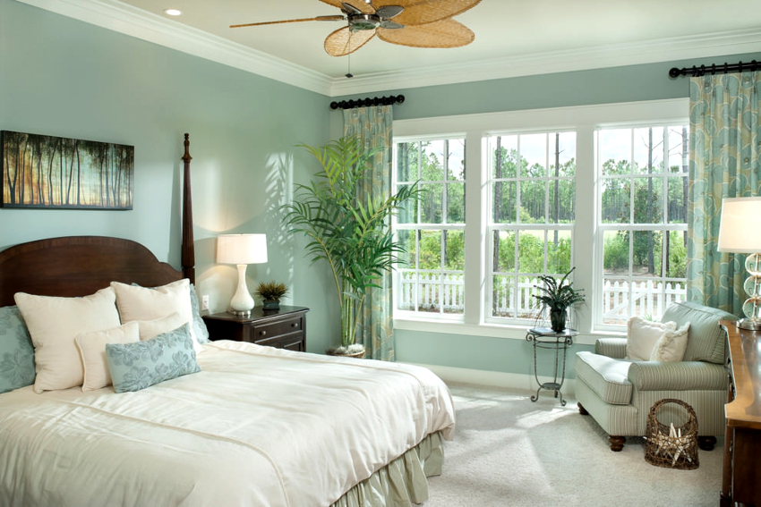 Hvis soveværelsesområdet ikke har brug for nogen udtryksfuld tilføjelse eller hvid forbedring, er det bedre at bruge gardiner i bløde og lyse pastellfarver.