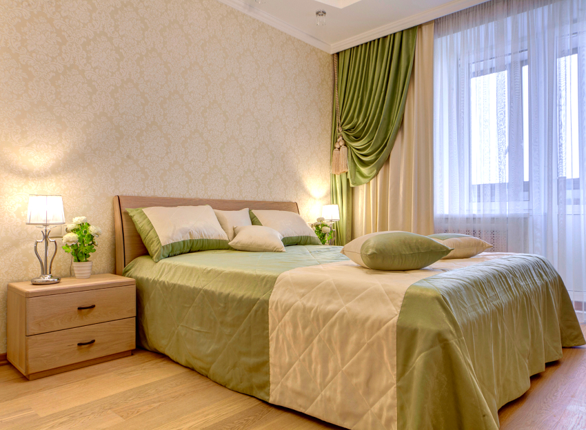 Fordele ved at bruge sæt: gardiner og sengetæppe til soveværelset i et stof