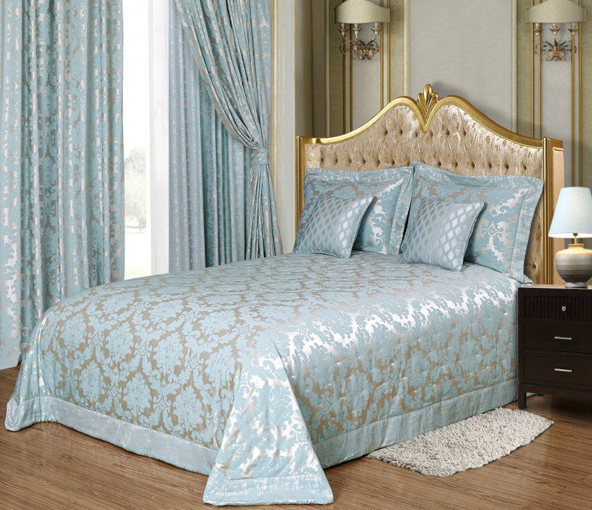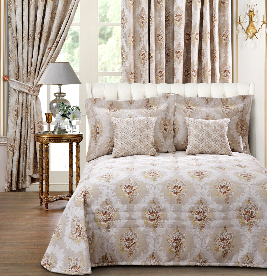 Den moderne industri producerer færdige sæt til soveværelset - gardiner og sengetæpper. Sættet kan også omfatte dekorative pudebetræk. Alle elementer er lavet af et stof, som kan være enten almindeligt eller farvet. Ofte sys sengetæppet på en voluminøs base, hvilket giver madrassens del af sengen en visuel pragt og blødhed.