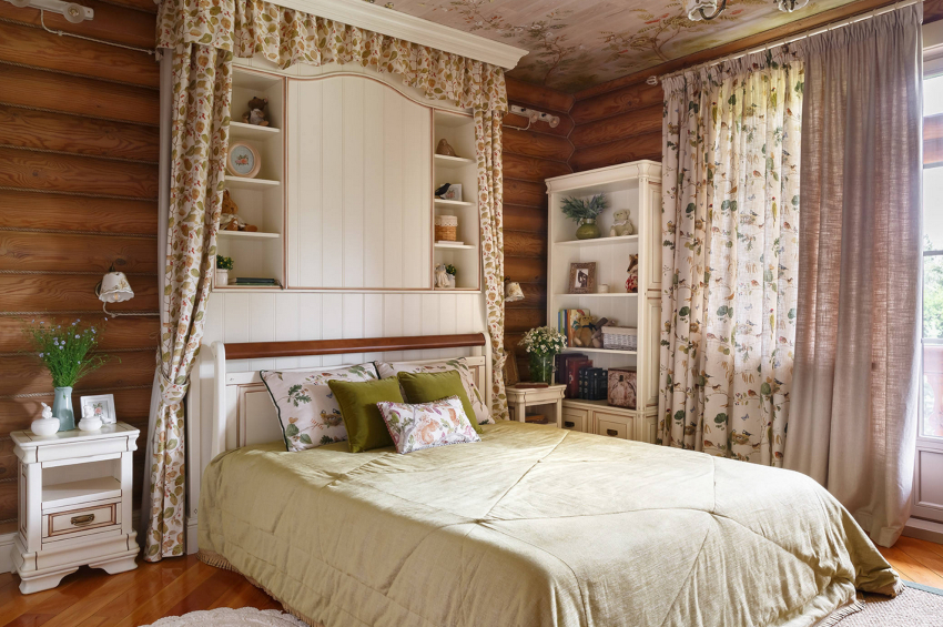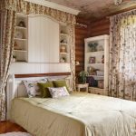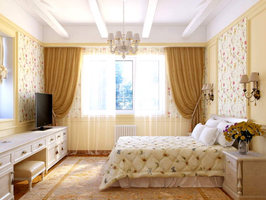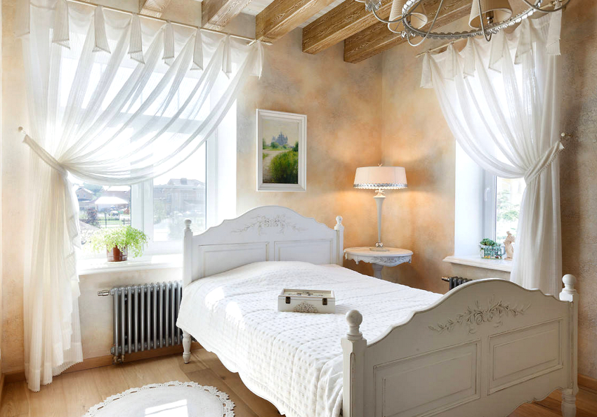 Gardiner i et landinteriør antyder tilstedeværelsen af et mønster og ofte ret stort (valget bestemmes af rummets størrelse - et stort mønster fungerer ikke for små soveværelser). Letvægts, naturlige stoffer. Dikkedarer, flæser, kroge kan være en interessant tilføjelse.