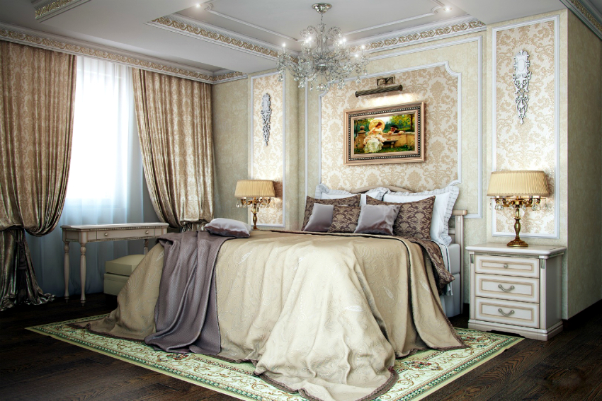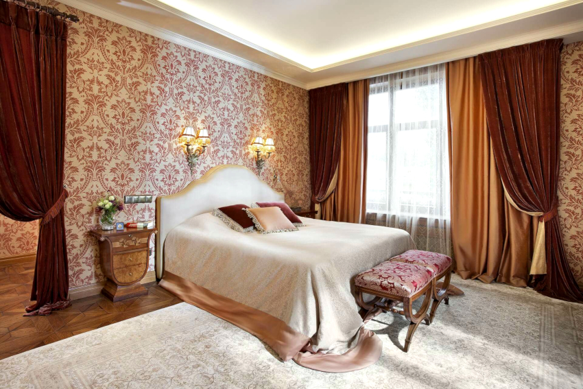 Brugen af et damaskmønster på sådanne gardiner giver dig mulighed for at bruge lærredet ikke kun i rustikke dekorationsstile, men også i klassiske soveværelser.