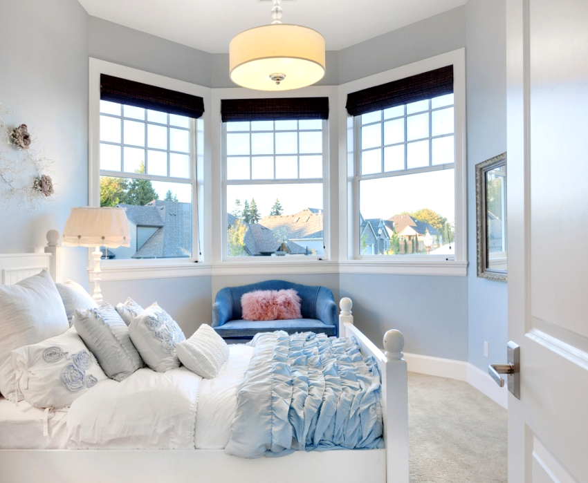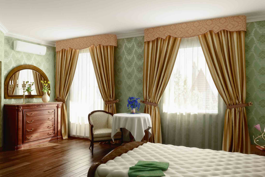 Hvis der er moler mellem karnapvinduerne, er det bedre at bruge en gesims og en lambrequin i hele dens længde. Billeder af soveværelser til visning af dem, der ønsker at arrangere vinduer på denne måde, vil ikke kun bede om typen, formen på dette dekorative element, men også dets optimale dimensioner.