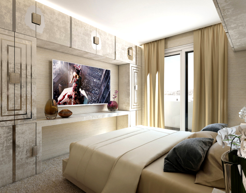 Gardiner til soveværelser i moderne moderne og højteknologiske stilarter er kendetegnet ved funktionalitet, simpelt snit og lakonicisme