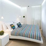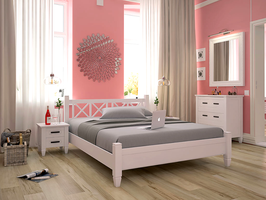 Hvid kaldes et soveværelse, hvor denne farve dominerer, hvilket betyder, at rummet har hvide vægge og andre indvendige detaljer i samme farve. Afhængigt af hvor mange af disse elementer der er, kan gardinerne være farvede eller hvide. Hvis der er meget hvidt, er det vinduesgardinerne, der bringer livlige noter. I dette tilfælde kan gardinernes skygge være kontrasterende, men ikke lyse, men dybe og skal også kombineres med andre indvendige elementer, såsom gulve, polstrede møbler, vægpaneler osv.