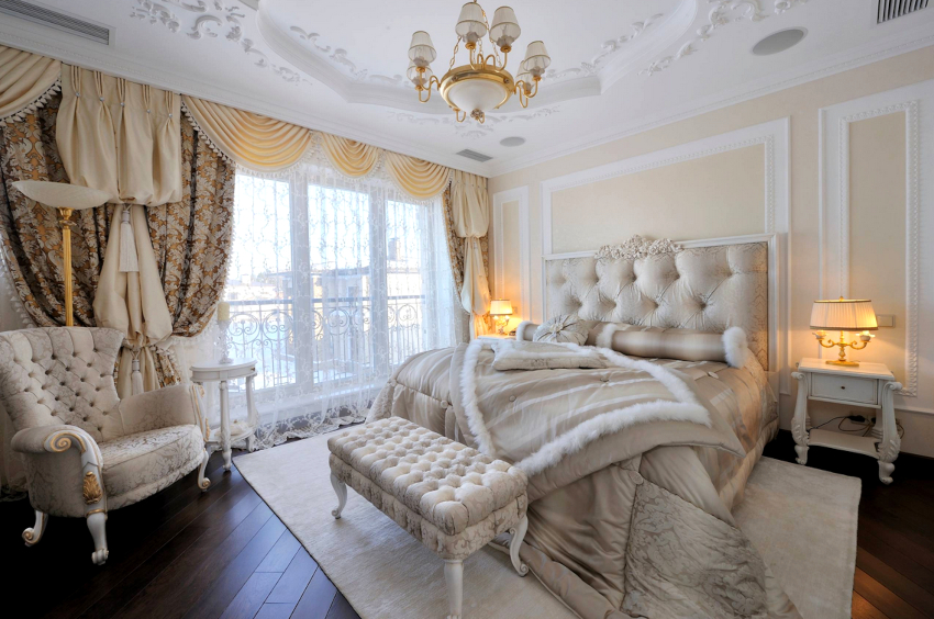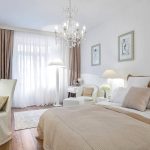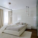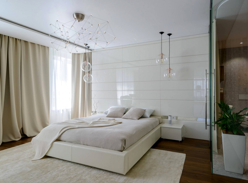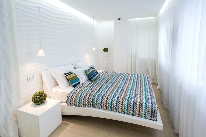 Lyse gardiner i et hvidt soveværelse kan være det vigtigste dekorative element i interiøret. Derfor er det meget vigtigt, at stoffet vælges med smag, accenten skal være behagelig og ikke prangende.