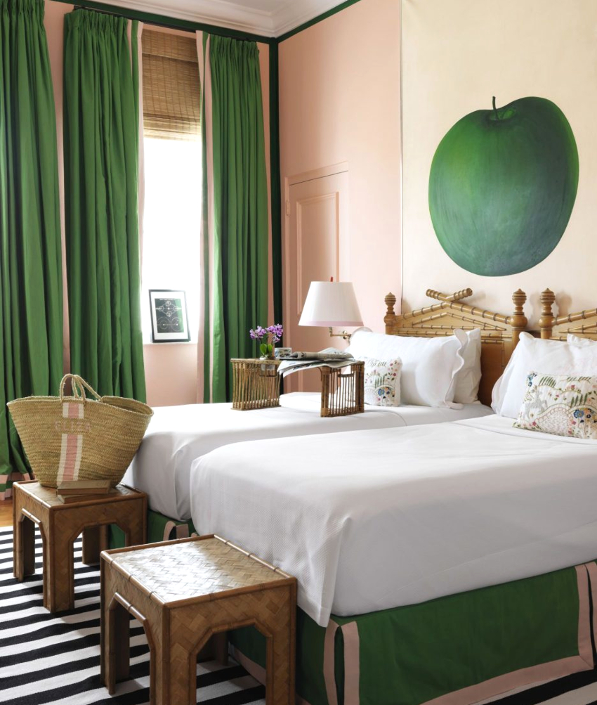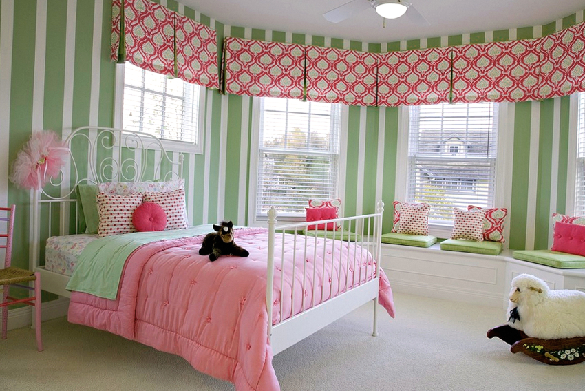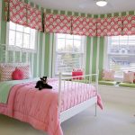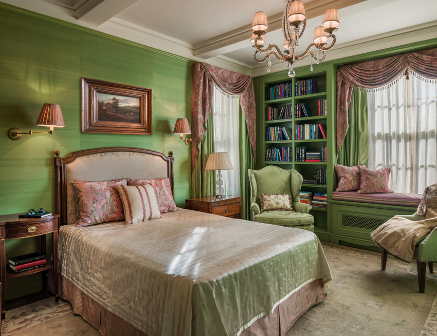 Karaflerne til karnapvinduet er oftest store lærred. I denne henseende kan der være et problem med valg af farve. Fortsættelsen af den skygge, der er tilgængelig i designet, medfører fare for tegn på monokrom. En betydelig forskel kan visuelt isolere området. Problemet med valgets kompleksitet kan løses med grønne gardiner i soveværelset. Skyggen skal vælges afhængigt af zonens størrelse: jo mindre den er, jo lysere er tonen. Gardiner kan kombineres med indendørs planter, mindre detaljer af samme farve på puder, sengetæpper, dekorative elementer på væggen.