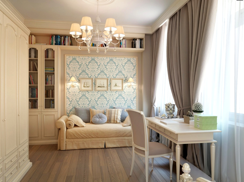 - Overbelast ikke rummet med tekstiler. Hvis gardinerne er brede, er det bedre at bruge tynde og bløde stoffer, som, når de er samlet, ikke skiller sig ud i tunge lagre.