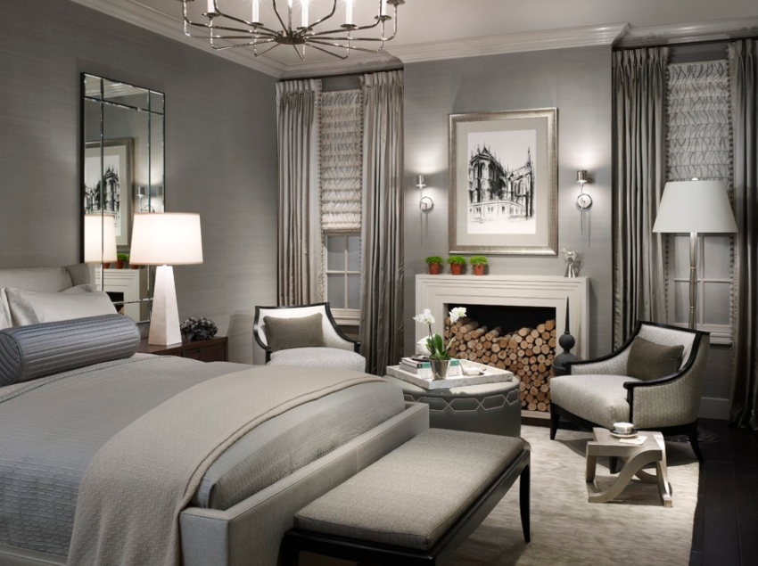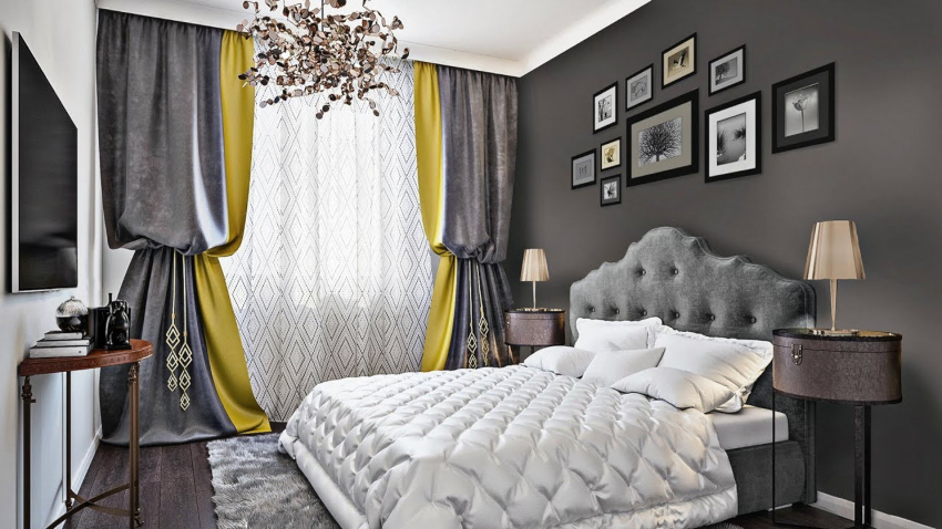 Tilgangen til valg af gardiner til et gråt soveværelse skal være helt anderledes. For at rummet som helhed ikke er kedeligt, skal du genoplive rummet ved hjælp af vinduesgardiner. Afhængigt af interiøret er det hensigtsmæssigt at dekorere vinduet med lærred med et mønster med en blank overflade, som nødvendigvis skal have et lille antal elementer af grå farve eller dens nuancer. At dekorere med dikkedarer, fletning, lambrequins er acceptabelt. Levende kontraster bør undgås. Når du dekorerer skandinaviske soveværelser, bliver hvide og lysegrå gardiner uden kunstnerisk behandling harmonisk.