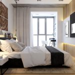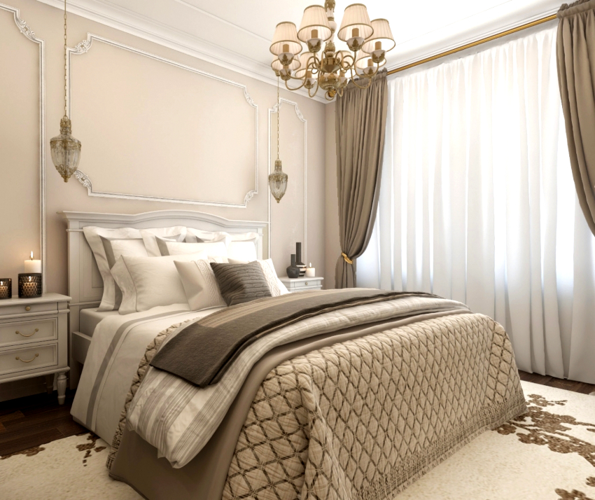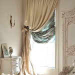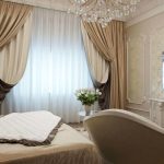 Gardiner spiller en væsentlig rolle i skabelsen af sådanne rummers generelle farvebaggrund. De bør ikke fusionere med væggenes farve, ellers bliver rummet ansigtsløst. For eksempel er det bedre at vælge gardiner til et beige soveværelse 1-2 toner mørkere eller lysere end den dominerende skygge. Du kan dekorere med lagre, pickupper. Et sådant vindue bliver et bemærkelsesværdigt element i interiøret, men vil ikke være et separat område af rummet.