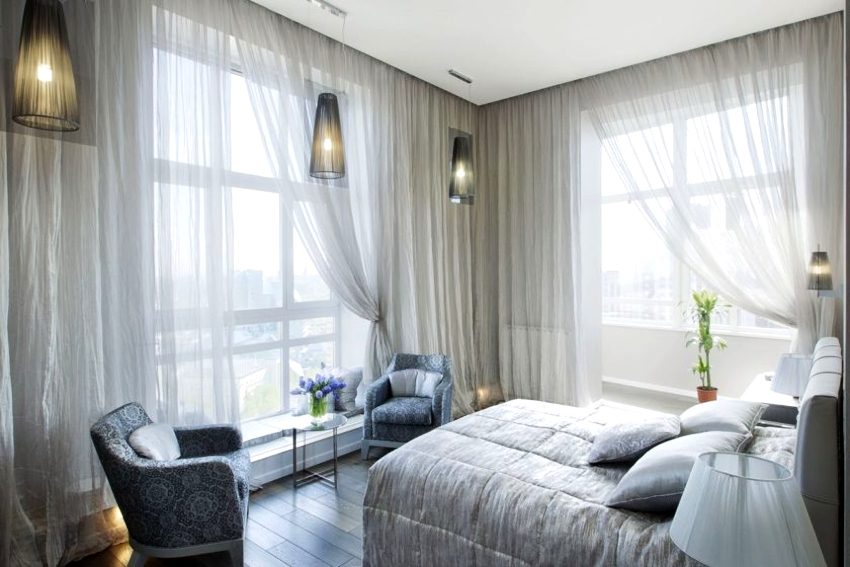 Vinduer, der er utilgængelige for nysgerrige øjne, behøver ikke være dækket af tykke gardiner. For at dekorere vinduesåbninger er det nok at hænge gardiner i soveværelset. Denne mulighed har en række ubestridelige fordele, især hvis den bruges i små rum: