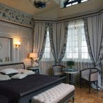 Når du kigger gennem de nyligt indsendte fotos af soveværelsesgardiner, kan du bemærke en tendens til en tungere bund. På gardiner opnås effekten ved hjælp af volumetrisk broderi på tykke gardiner - ved at forlænge lærredene (den nederste del af gardinet ligger på gulvet).