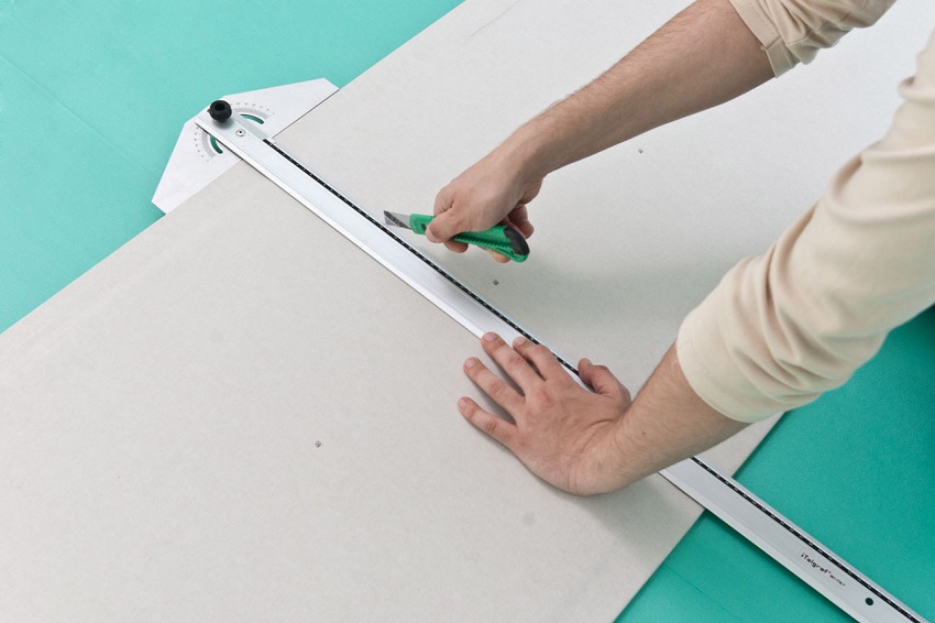 - først skal du presse linealen til overfladen af gipspladen. Linealen skal presses strengt langs skærelinjen;