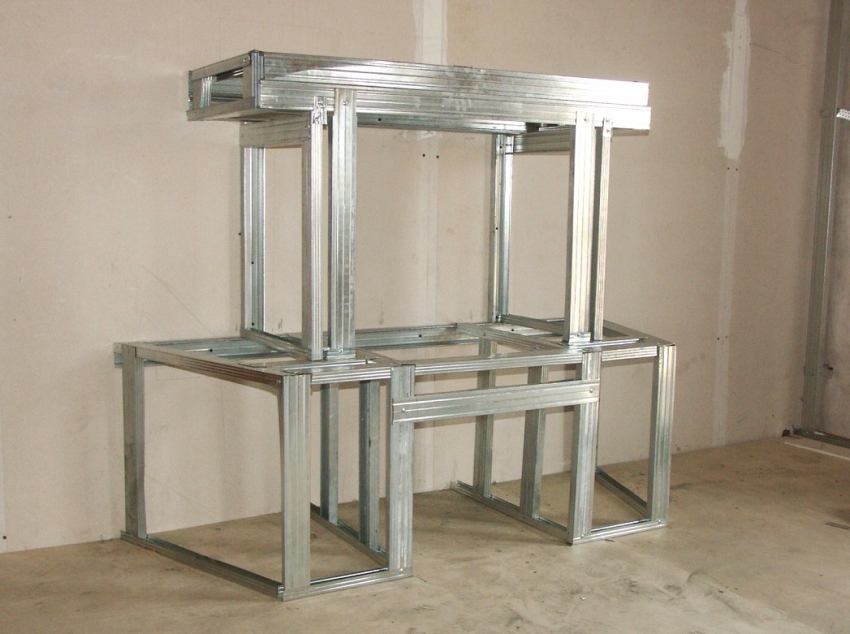 Derefter fastgøres styreprofilerne langs forbrændingskammerets kontur. Derefter fastgøres profilen på gulvet, som er fastgjort langs brystlinjen. Derefter monteres de forreste søjler, hvoraf afstanden til bagvæggen er en indikator, der bestemmer ildstedets dybde. De forreste stivere er forbundet sammen ved hjælp af tværstænger. De forreste stivere er docket med bagvæggen ved hjælp af tværelementer placeret i vandret plan.