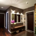 Det er nødvendigt at være opmærksom på korridoren. I et rum, der mangler naturligt lys, skal du bruge væglamper, lampetter og lysekroner. Yderligere belysningsarmaturer vil tilføje hygge til rummet såvel som visuelt udvide den smalle korridor. En meget vigtig detalje er vægspejlet. Takket være refleksioner skabes illusionen om et rum, der strækker sig ned i dybet, hvilket også tilføjer lys.