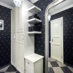 Hjælpsomme råd! I små gange er det bedre at skjule alle ting i lukkede skabe og ikke bruge for mange iøjnefaldende dekorative elementer for ikke at rod i et allerede lille rum. En god mulighed er en loftshøj garderobe med mange hylder og ekstra opbevaringsrum.