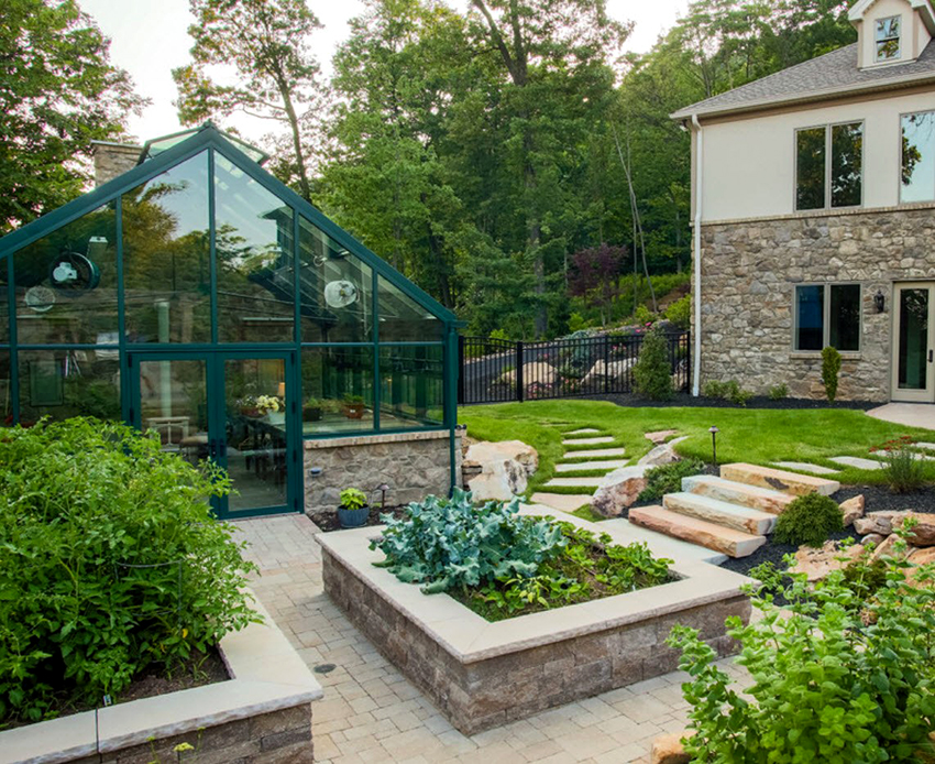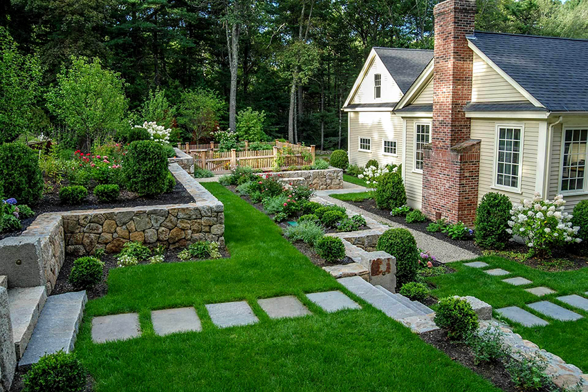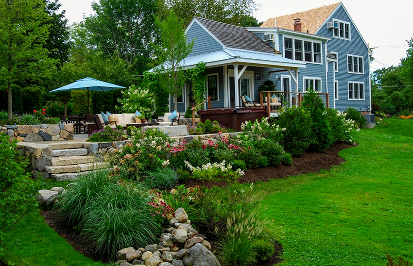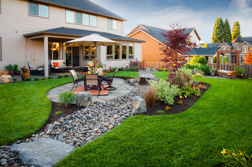 Landskabspleje af gården til et privat hus. Billeder af moderne gårde med dekorative elementer