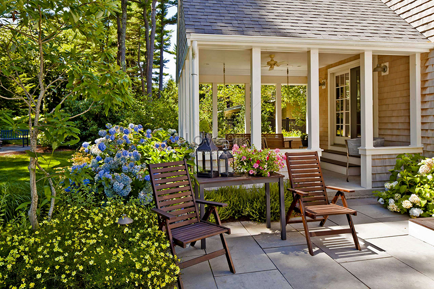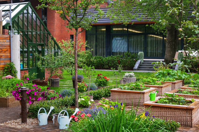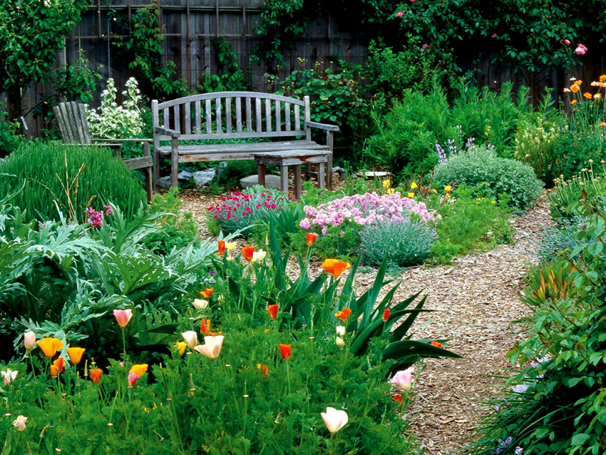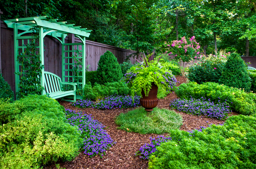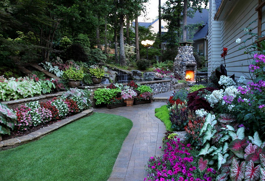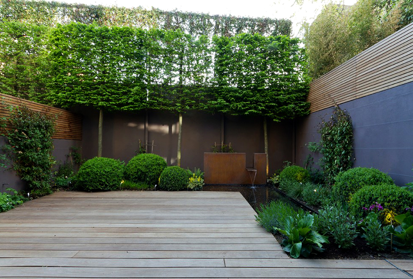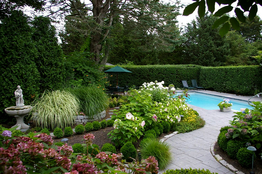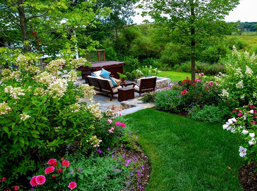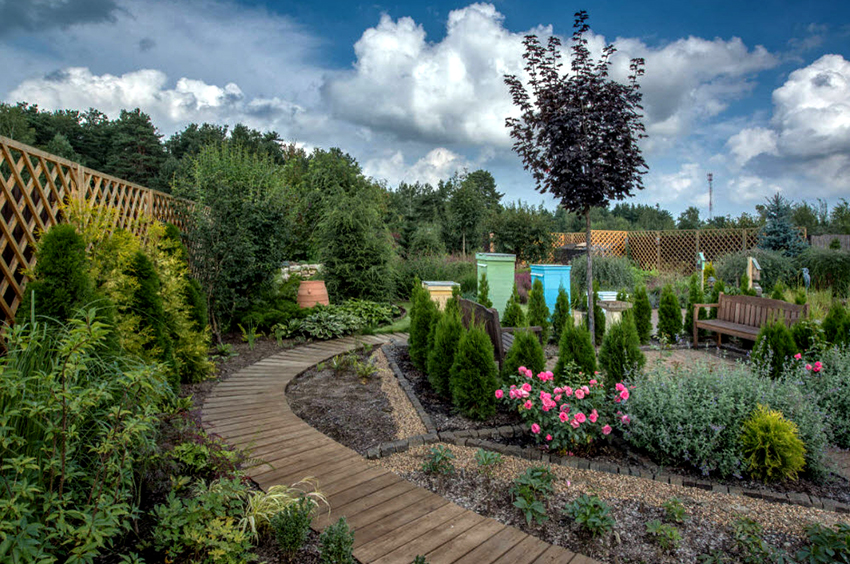 Efter afgrænsning af rummet, design af stier og andre funktionelle steder kan du starte landskabspleje. Det er meget vigtigt at vælge og placere planterne korrekt afhængigt af deres størrelse og blomstringsperioder. Det er værd at starte med de største planter, buske og træer. Med deres hjælp skabes skyggefulde områder i haven, perfekt beskyttede, også fra vinden.