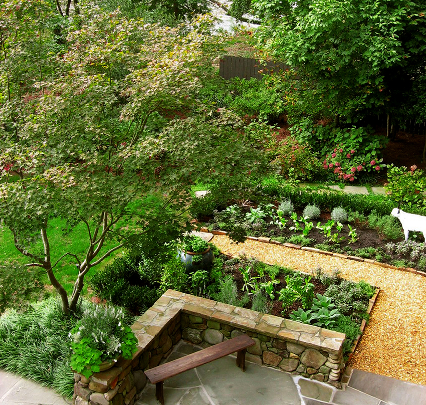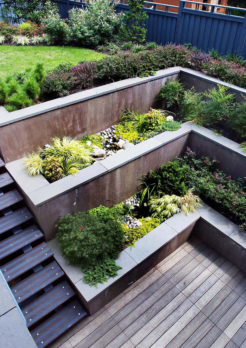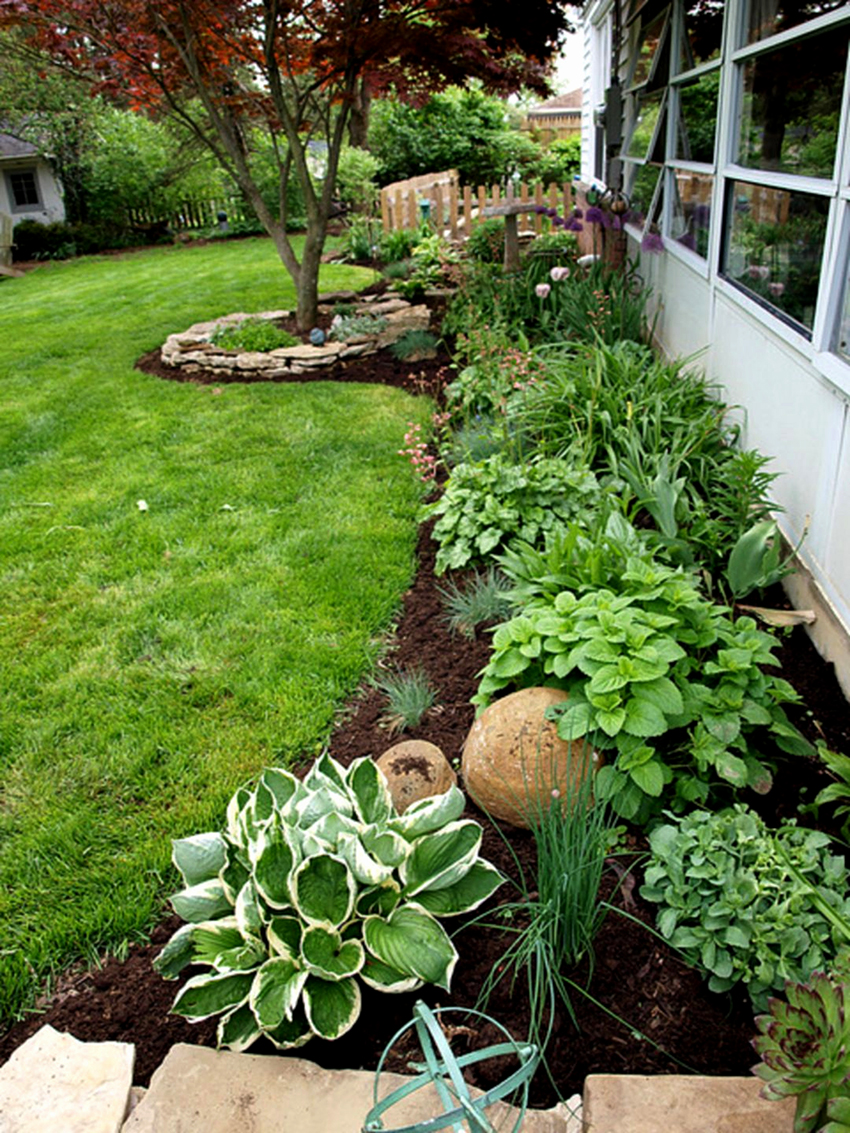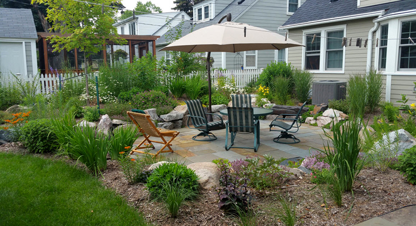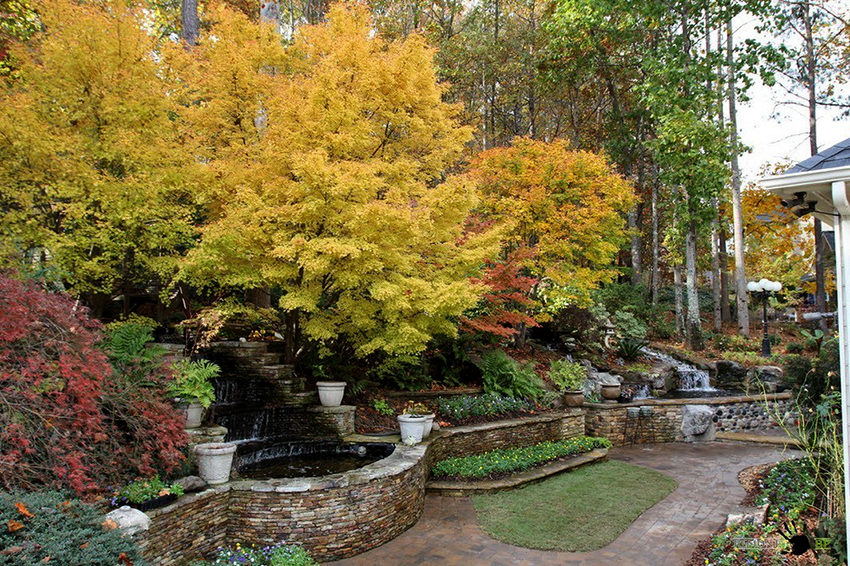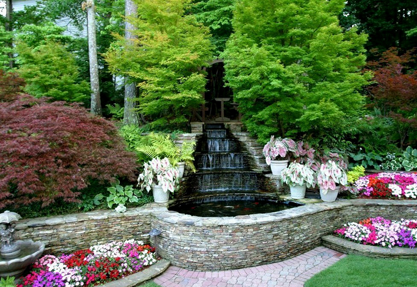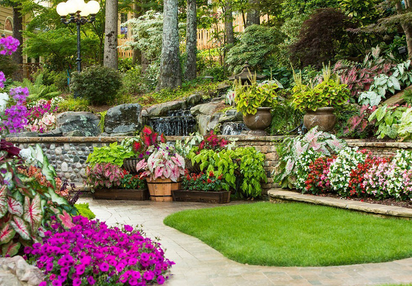 Efter afgrænsning af rummet, design af stier og andre funktionelle steder kan du starte landskabspleje. Det er meget vigtigt at vælge og placere planterne korrekt afhængigt af deres størrelse og blomstringsperioder. Det er værd at starte med de største planter, buske og træer. Med deres hjælp skabes skyggefulde områder i haven, perfekt beskyttede, også fra vinden.