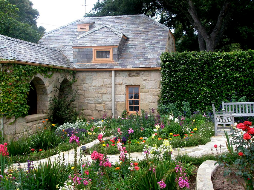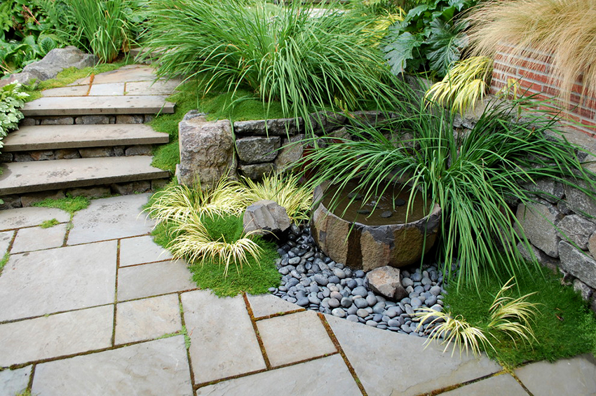 Når du lægger stier, kan du efterlade et lille mellemrum mellem pladerne og fylde det med små småsten, sand eller havegræs. I sådanne intervaller kan små blomstrende planter plantes. Timian, nelliker, primula og enhver dværgplante vil gøre.