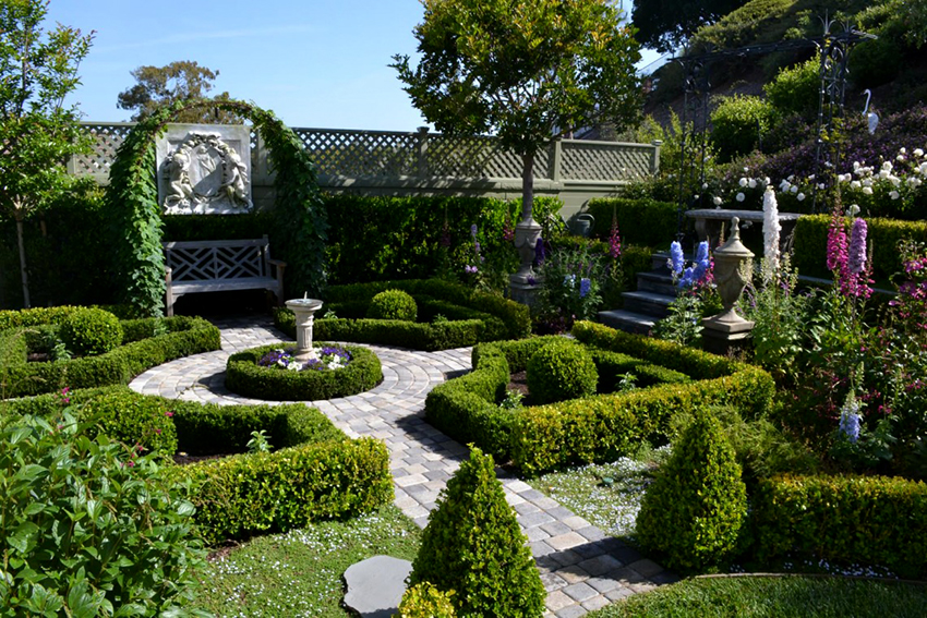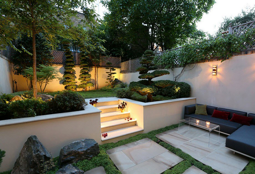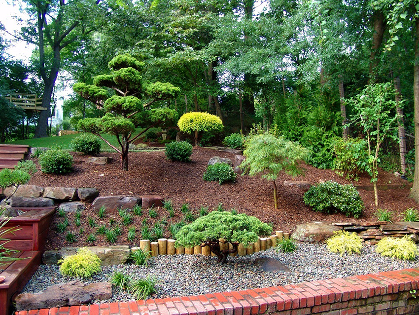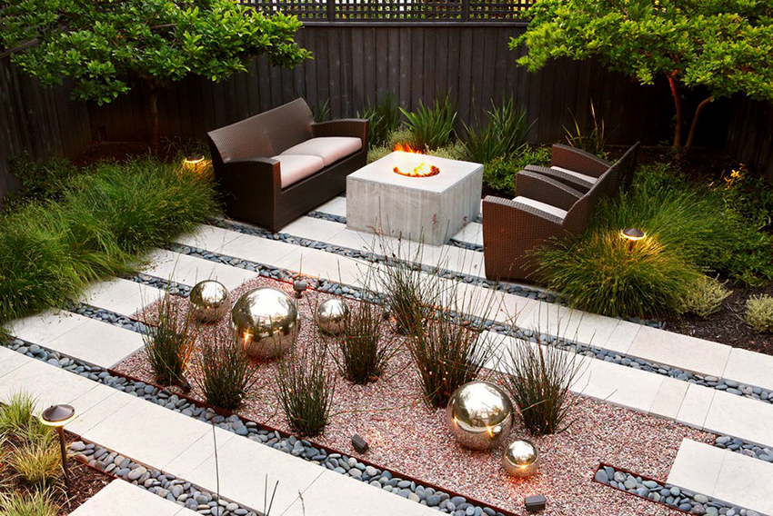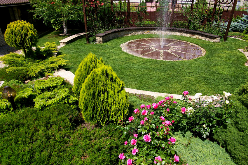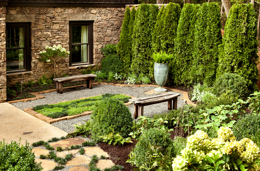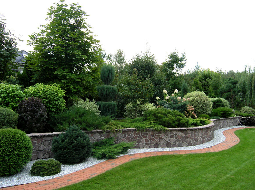 Separate stykker hjælper med at henlede opmærksomheden på de mest interessante og vigtige designelementer. Under et stort træ kan du placere en bænk, en ubeskrivelig grøn græsplæne fortyndes med en lys rosenbuske, og enebærkratt vil skabe en restriktiv grænse.