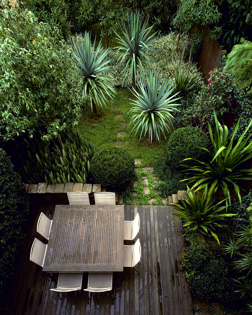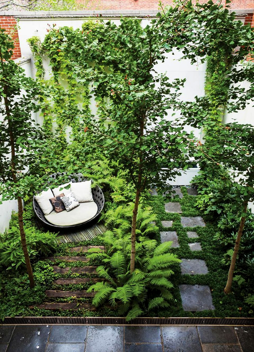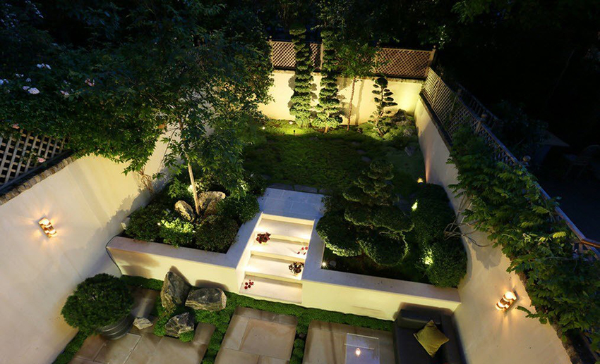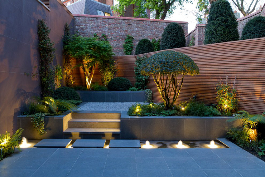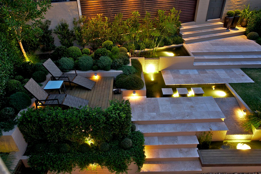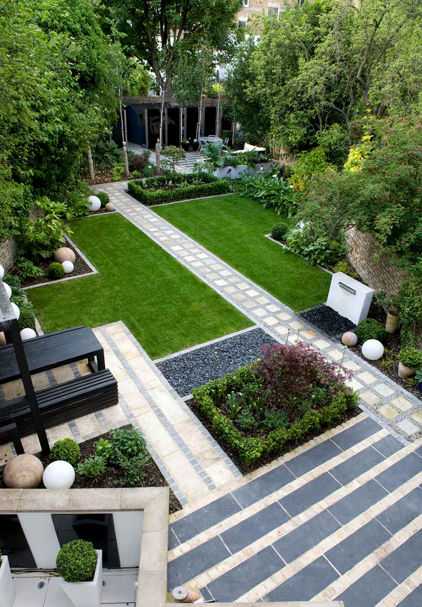 Separate stykker hjælper med at henlede opmærksomheden på de mest interessante og vigtige designelementer. Under et stort træ kan du placere en bænk, en ubeskrivelig grøn græsplæne fortyndes med en lys rosenbuske, og enebærkratt vil skabe en restriktiv grænse.