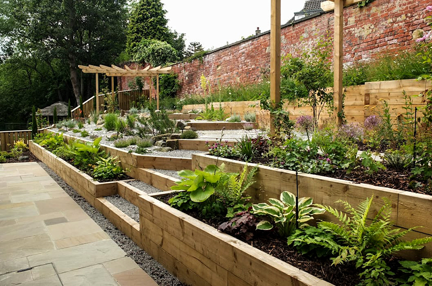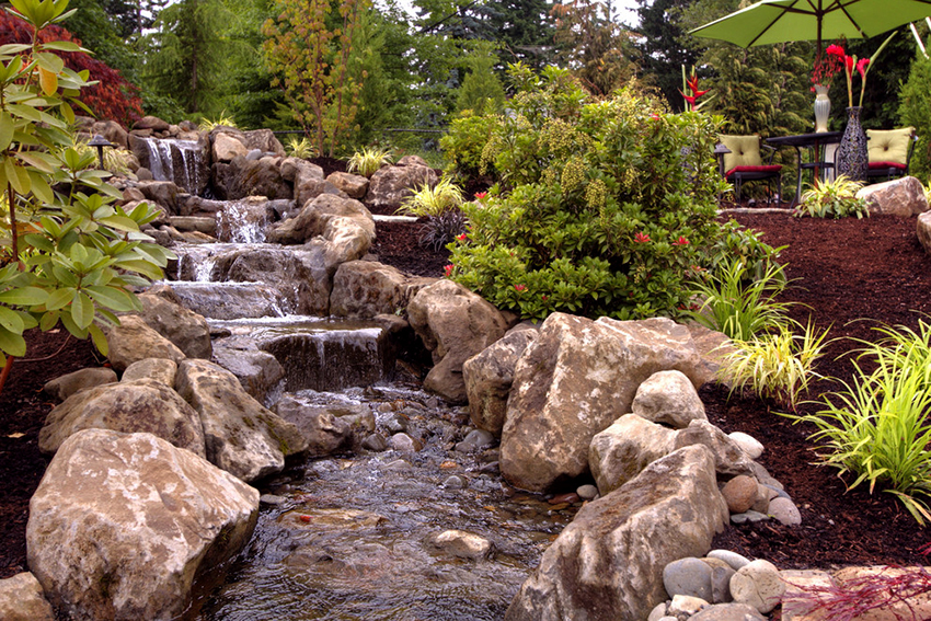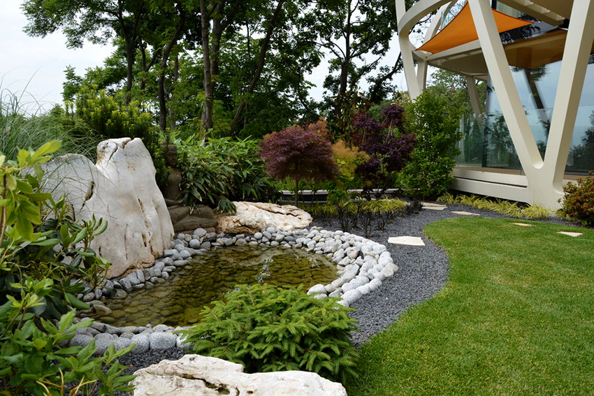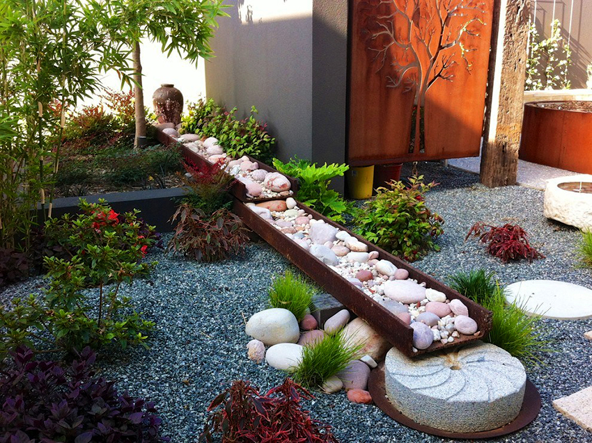 De dekorative elementer inkluderer originale urtepotter lavet af skrotmaterialer. Disse kan være gamle tønder, unødvendige sko, ubrugte haveværktøj. En gammel cykel, der læner sig mod et kurvhegn og foret med blomsterpotter, store kander med en tør efterligning af en strøm og meget mere, der dukkede op som et resultat af en fantasiflugt, ser godt ud.
