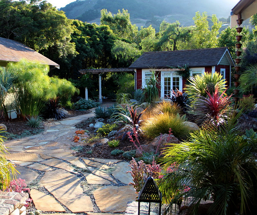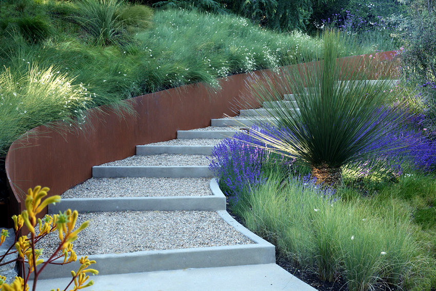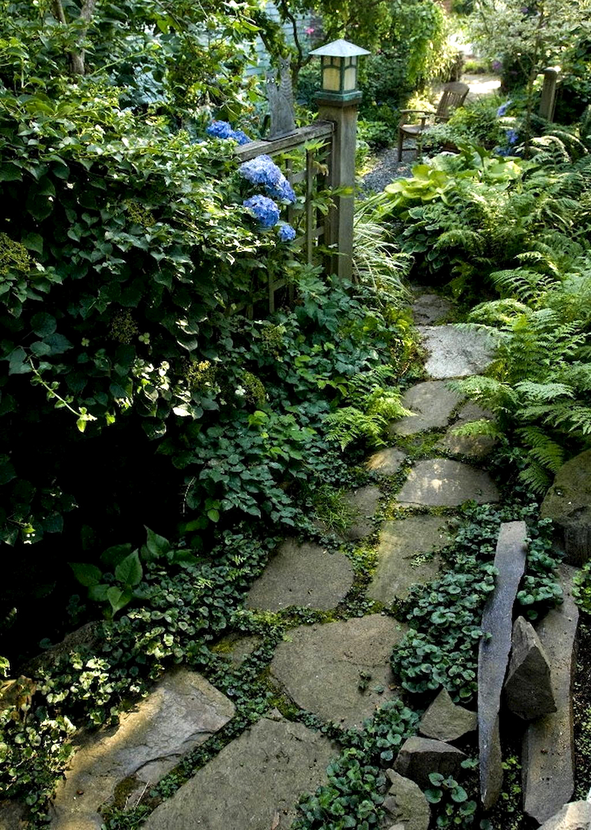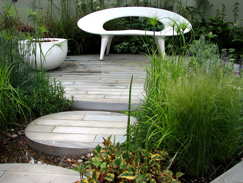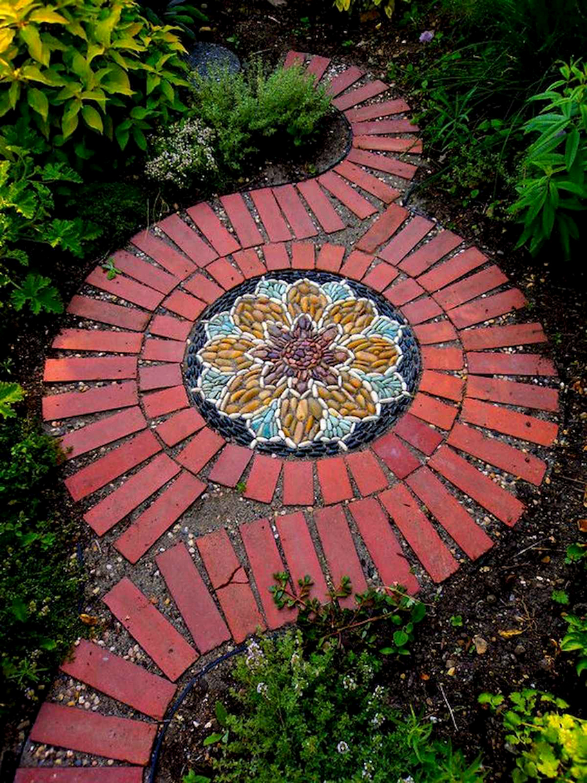 Spor i umiddelbar nærhed af hjemme, skal udføres i streng stil. Her materialer som brolægning, beton, rød og hvid mursten... I mere uformelle områder, såsom nær kunstig dam eller i en mini-skov, når du organiserer stier, er det bedre at bruge uregelmæssige former, materialer med forskellige strukturer og dimensioner.