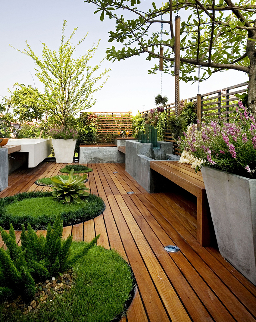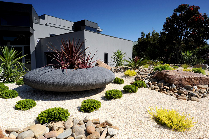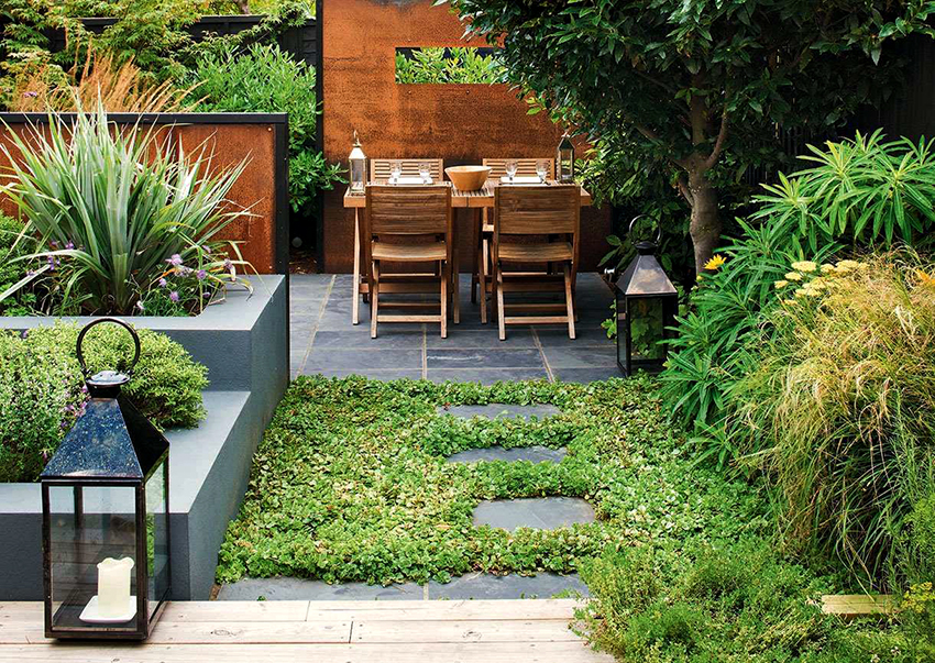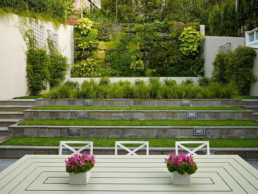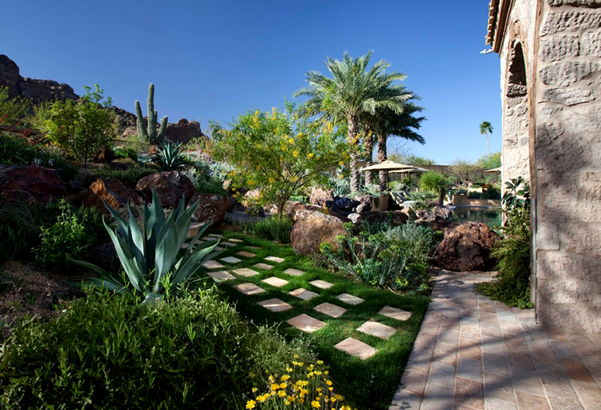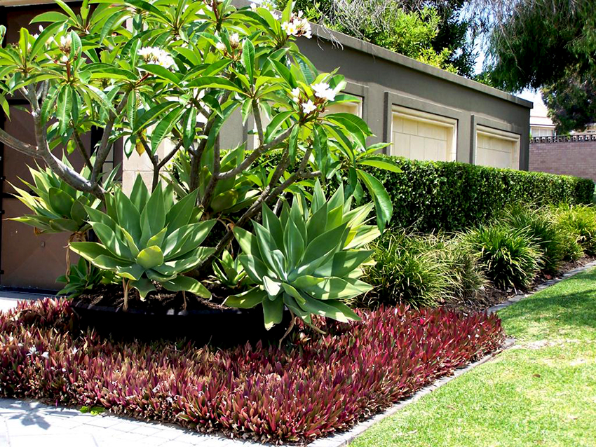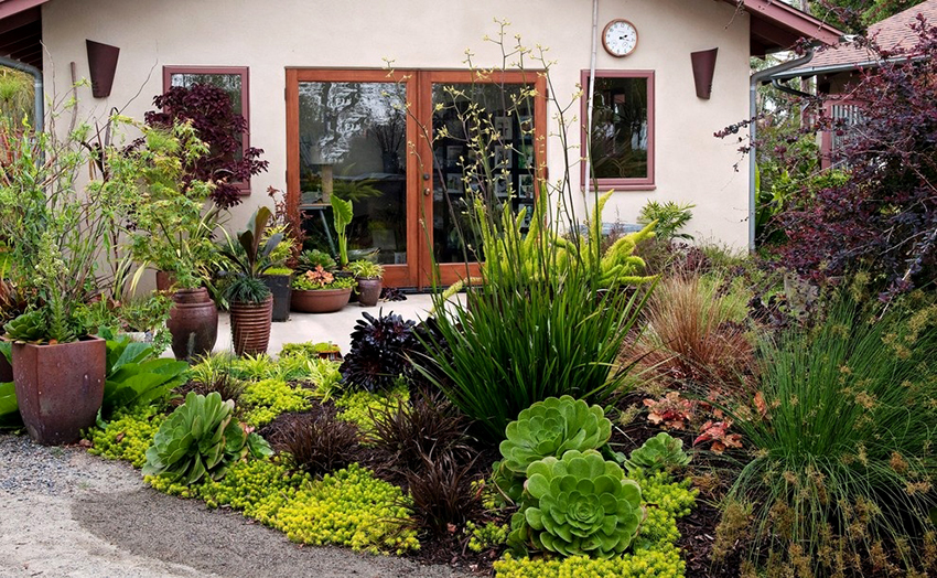 Hvis du ikke har tid til at klippe plæner ofte, kan du arrangere blomsterpotter med uhøjtidelige prøver i hele haven. I kolde perioder opbevares de indendørs, og om foråret, når de første varme dage kommer, føres de ud på gaden. Således er det muligt at dyrke varmekærlige planter som citron, mandarin, cypress og andre.
