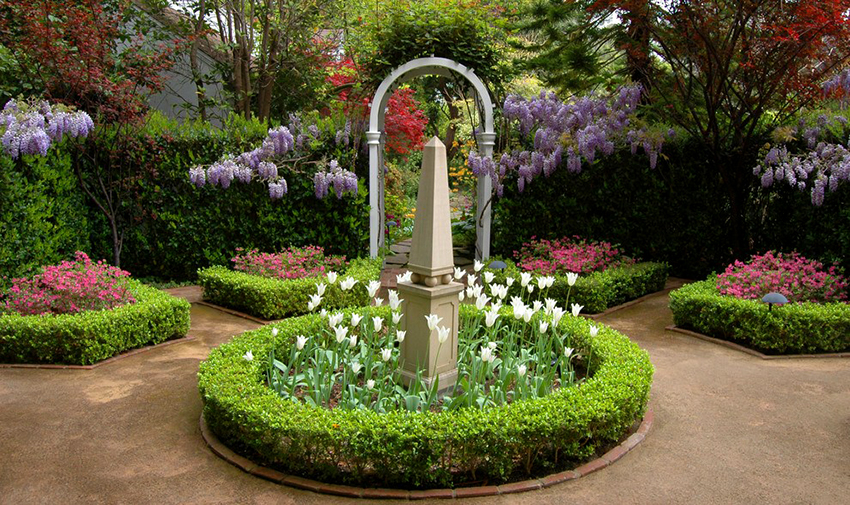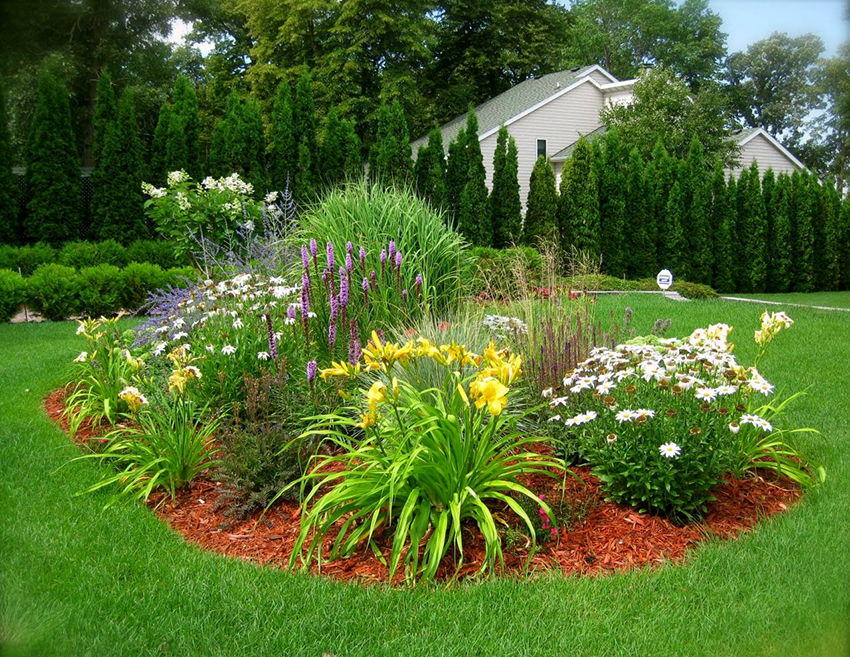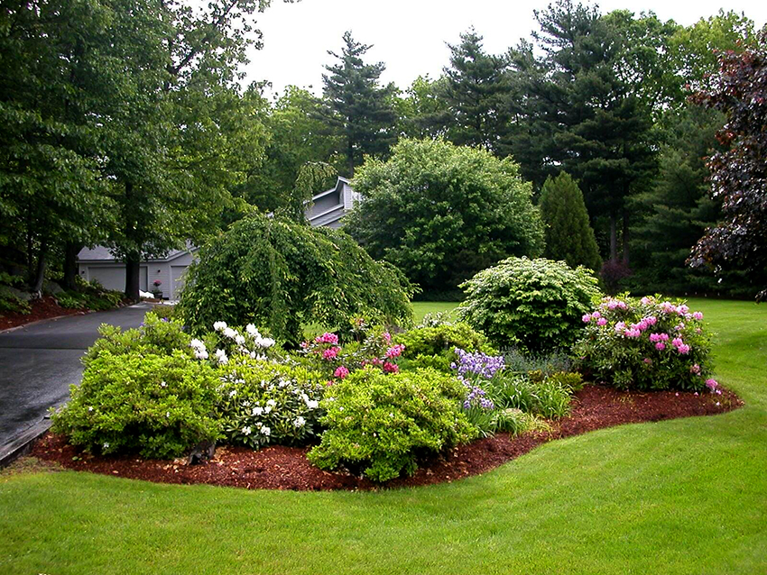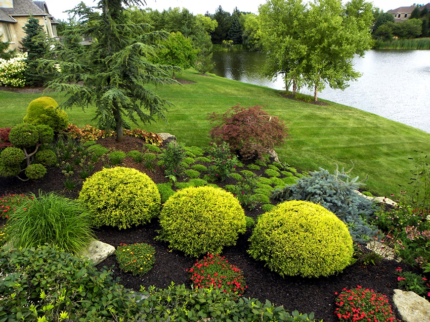 Denne tilgang gør det muligt at organisere blomstersengder vil fange øjet næsten hele året rundt. For at forhindre blomsterbed i at se tomme ud om vinteren skal de fortyndes med små nåletræer.