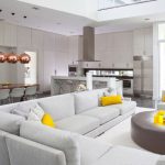 Das Wohnzimmer in einem modernen Stil, in Beige und Creme gehalten, sieht organisch aus. Ein so warmer Raum hilft Ihnen, sich nach einem anstrengenden Tag zu entspannen, und betont die aufrichtige Atmosphäre Ihres Zuhauses. Für einen großen Raum können Sie eine gelbbraune Palette verwenden, die die gesamte Atmosphäre mit Sonnenlicht und Fröhlichkeit erfüllt, was durch Fotos der Innenräume des Wohnküchens in einem modernen Stil deutlich wird. Sie sollten hier jedoch keine hellen Farben verwenden, die trotzig aussehen. Es ist besser, sich für blasse Pastell- und Senftöne zu entscheiden.