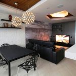 Wenn eine Spanndecke montiert wird, sehen zahlreiche kleine Scheinwerfer organisch aus. Bei der Organisation einer zweistufigen Trockenbaukonstruktion können LED-Streifen verwendet werden. Die gleiche Beleuchtung ist für die Beleuchtung eines Kamins in einem modernen Wohnzimmerinterieur relevant. Für die lokale Beleuchtung von Funktionsbereichen sollten Wand- oder Tischleuchten mit Metallgehäuse verwendet werden. In diesem Fall wäre es angebracht, matte Lampen mit traditioneller zylindrischer oder runder Form zu verwenden.
