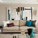 Abstrakte Gemälde im Inneren des Wohnzimmers in einem modernen Stil mit massiven Rahmen werden an schlichten Wänden einzigartig aussehen. Aquarellmalerei oder Schwarzweißgrafiken können eine gute Option sein.