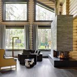 Die Verwendung von Holzbalkendecken in einem modernen Wohnzimmer verleiht einem progressiven Interieur einen Hauch von ländlichem Leben
