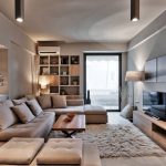 Eine moderne Technik für die Innenausstattung eines Wohnzimmers in einem modernen Stil ist die Beleuchtung von Nischen und offenen Regalen. Hierzu werden LED-Pfade mit weißem Licht verwendet, die dem Innenraum einen hellen Akzent verleihen. Wenn im Wohnzimmer ein Podium organisiert ist, können an der Stelle des Höhenunterschieds Lampen eingebaut werden, wodurch der schwebende Effekt erzeugt wird. Eine Stehlampe passt organisch in den Erholungsbereich und beleuchtet einen kleinen Raum. Solch ein schwaches Licht ermöglicht es Ihnen, sich in der Nähe des Kamins so weit wie möglich zu entspannen. Fotos von Wohnzimmerinterieurs in einem modernen Stil zeigen verschiedene Optionen für die Beleuchtung in Zonen.