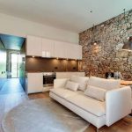 Bemalte monochromatische Wände sind ein guter Hintergrund, um eine der Oberflächen oder Teile davon mit flexiblem Naturstein zu veredeln, was sich in High-Tech-Wohnräumen widerspiegelt. Diese Verkleidung eignet sich auch gut für Zierputz. Die weiche Akzentwand hinter dem Sofa wirkt luftig und vollständig.