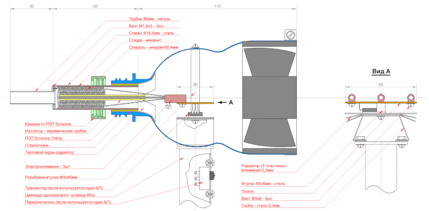 Es ist notwendig, dass die Heizung selbst klein ist. Der Außendurchmesser der Spirale sollte 4-8 mm nicht überschreiten. Für die Basis, auf der der Heizteil befestigt wird, ist es am besten, ein Material zu verwenden, das eine ausgezeichnete Beständigkeit gegen hohe Temperaturen aufweist, beispielsweise kann Keramik verwendet werden.